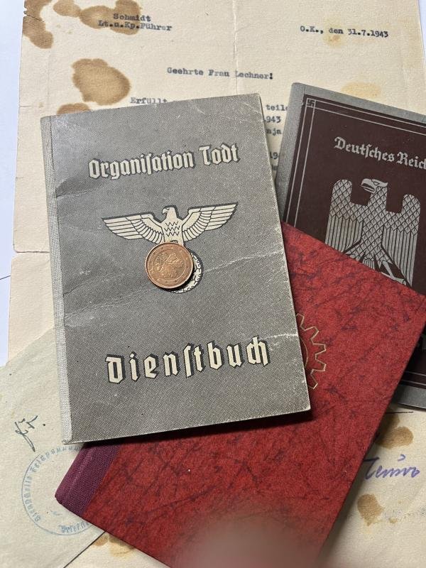 'Organisation Todt' grouping of Wilhelm Lechner.1) O.T. 'Dienstbuch' of Lechner who served n the Saarbrücken and Amiens regions.2) 'Arbeitsbuch of Lechner'3) DAF membership book of Lechners wife?4) Letter that Wilhelm was KIA at the 'Ostfront'.