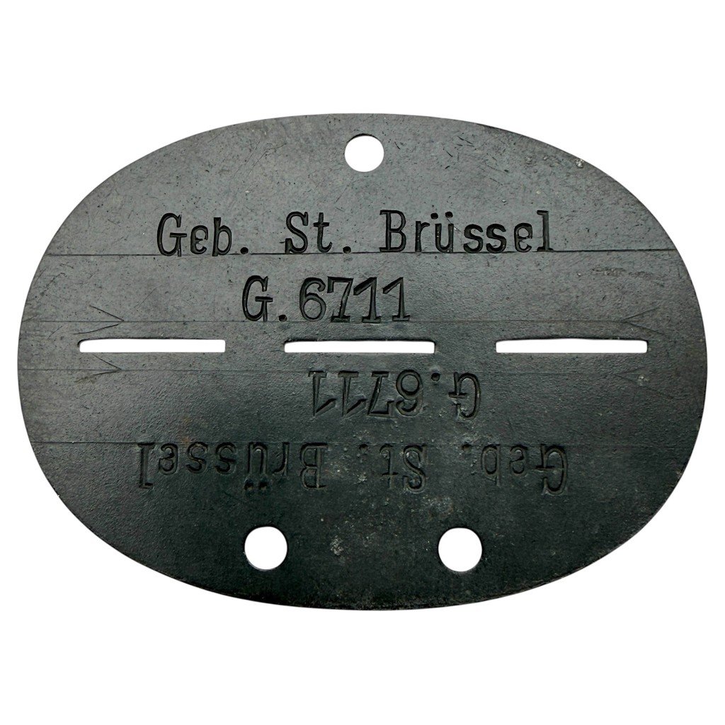 Original German Erkennungsmarke marked 'Geb. St. Brüssel' from the Second World War.This identification tag was used by German guard units stationed in Brussels, Belgium.It is a rare type of Erkennungsmarke specifically linked to occupation forces in the city of Brussels.Stamped with markings including G.6711 and clear unit designation.A historical and rare piece directly connected to the German presence in Belgium during the war.Highly interesting for collectors of German militaria and occupation-related items.Article number 18782Originele WWII Duitse 'Gebiet Stadt Brüssel' ErkennungsmarkeOriginele Duitse Erkennungsmarke met inscriptie 'Geb. St. Brüssel' uit de Tweede Wereldoorlog.Deze identificatieplaat werd gebruikt door Duitse bewakingseenheden gestationeerd in Brussel in België.Het betreft een zeldzaam type Erkennungsmarke specifiek gelinkt aan het bezettingsapparaat in de stad Brussel.Voorzien van gestanste markeringen waaronder G.6711 en duidelijke eenheidsaanduiding.Een historisch en zeldzaam stuk dat direct verbonden is aan de Duitse aanwezigheid in België tijdens de oorlog.Zeer interessant voor verzamelaars van Duitse militaria en bezetting gerelateerde objecten.