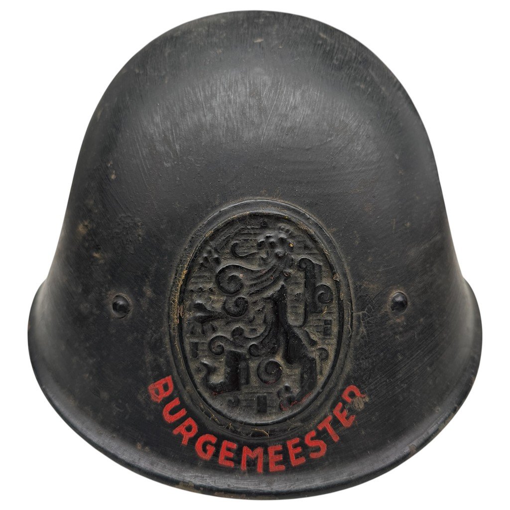 Original Dutch Air Protection Service helmet from the Second World War.This helmet is specifically marked for use by a mayor and features the red 'BURGEMEESTER' designation on the front.It is fitted with a central Dutch coat of arms in relief on the front.The helmet is finished in black and shows clear signs of use and wear consistent with the period.Handwritten markings are present inside, indicating personal use.A rare and distinctive piece directly connected to civil defense in the Netherlands during the war.Mayor-designated helmets within the Air Protection Service are significantly less common.Highly interesting for collectors of Dutch militaria and civil defense items.Article number 18783