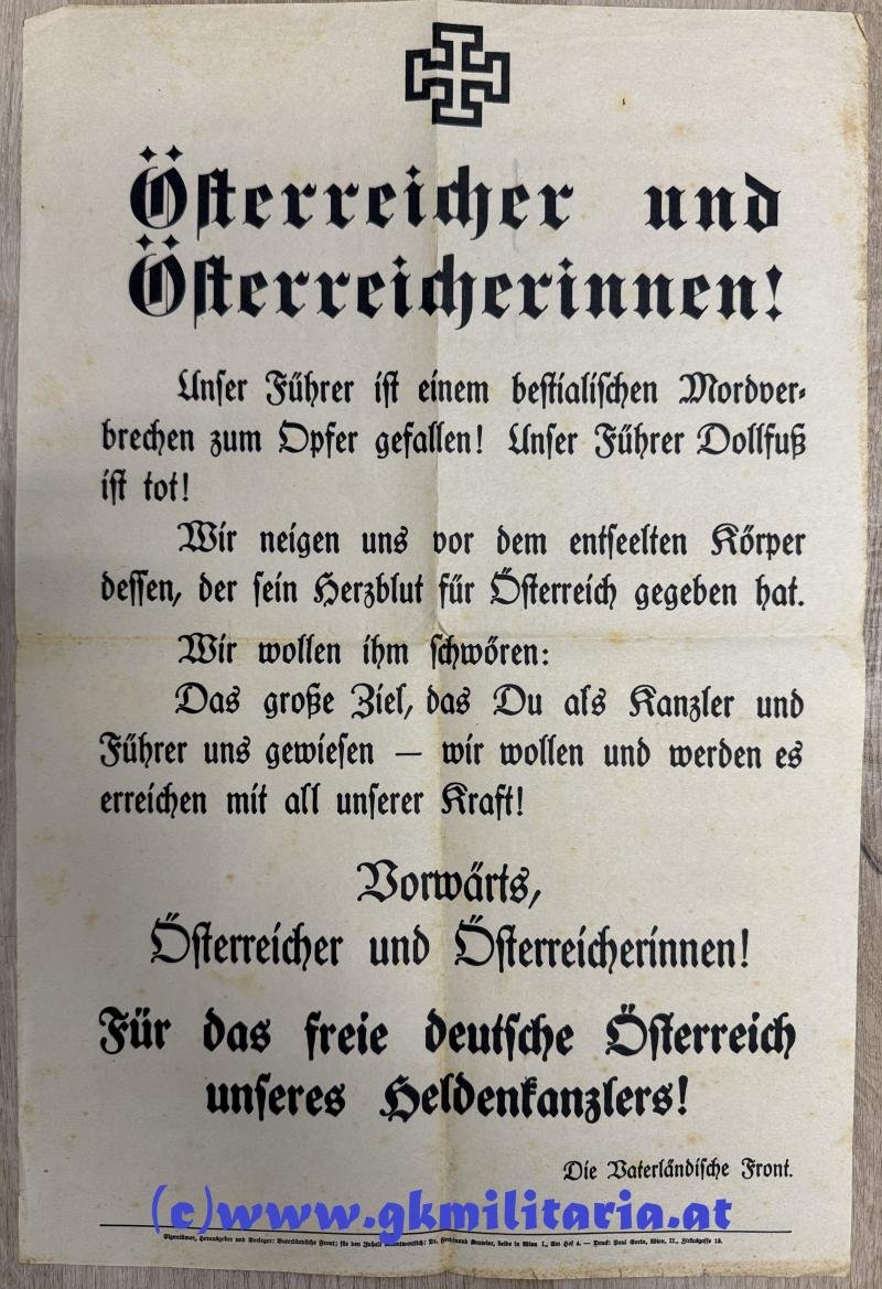 Plakat 'VaterlÀndische Front' - 'Tod unseres Heldenkanzlers Dr. Dollfuà 1934' !! - Aufgelegt von der VaterlÀndischen Front - Druck: Paul Gertn, Wien - Format: 46cm x 30,6cm - mehrmals gefaltet - guter gebrauchter Zustand!