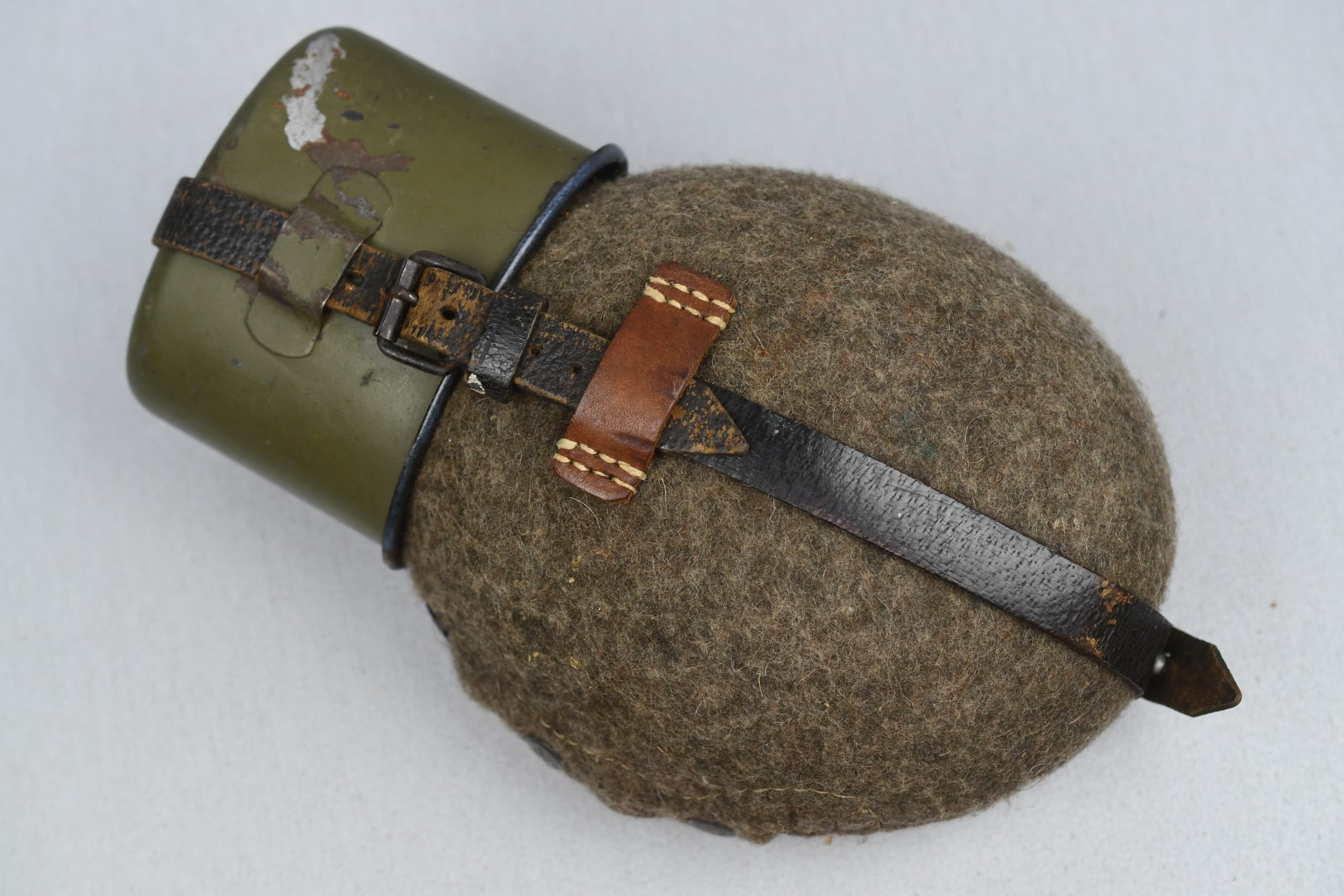 A very nice late war German Wehrmacht canteen, a typical reissued example as commonly seen due to the German practice of reusing equipment. The flask itself is marked SMM41, indicating production in 1941, but this set was clearly reissued and reassembled later in the war, most likely around 1943. This makes it a great representation of wartime resourcefulness and reuse.The highlight of this set is without doubt the rare canteen cup, marked AEMA43. It features the desirable blue enamel interior combined with a green painted exterior, a combination that is highly sought after by collectors. These cups are not commonly encountered and significantly enhance the appeal of the set.The canteen is fitted with a late war cover featuring PRYM marked press studs and a typical late war strap made from ersatz/pigskin leather. A nice detail is the brown leather reinforcement tab on the cover where the black strap passes through, showing the typical material and color variations seen in late war production. A very attractive and well-matched set in excellent condition with a rare cup as its centerpiece.