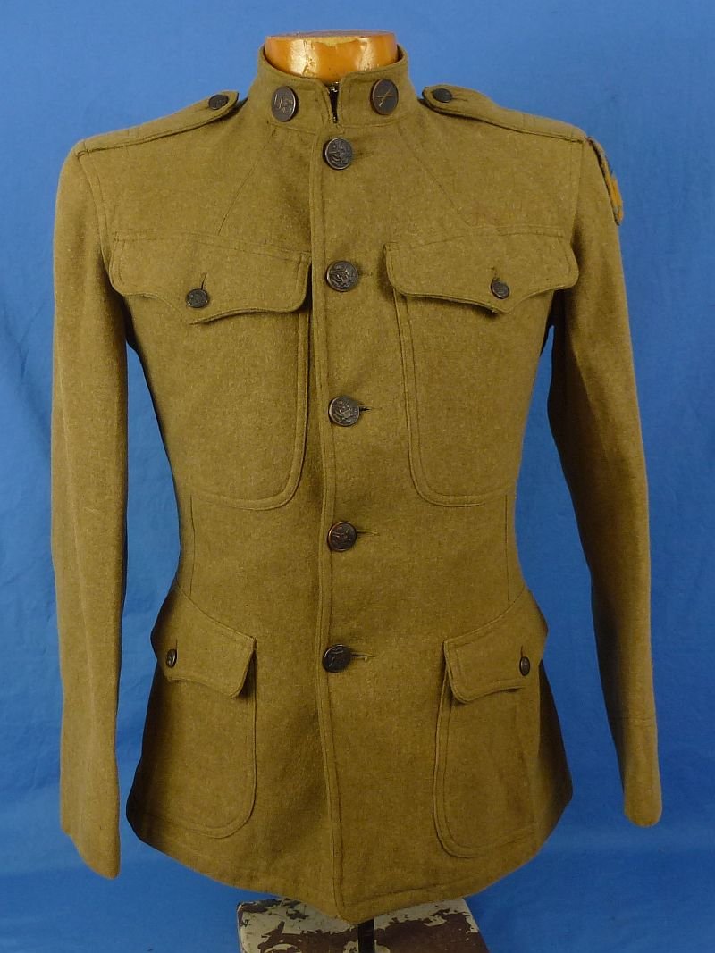 The wool tunic bears 'U.S.' and infantry branch collar disks. The shoulder carries the insignia of the 138th Infantry Regiment of the 35th Division, Lower on the left sleeve are two red chevrons, perhaps originally discharge chevrons that were used on the uniform in place of a conventional corporal rank chevron. Below this is a single overseas service chevron. The interior lining bears the handwritten name of 'W.S. Pitts'. The contractor label is retained beneath the hem of the lining. The tunic shows expected signs of age, but it is without holes, damage or repairs and it is in overall very good condition.