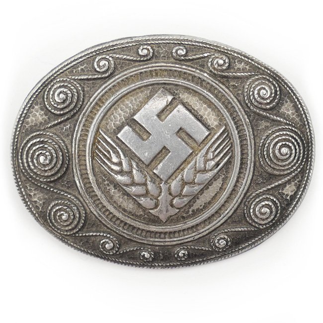 This is a nice example of the RADwJ Remembrance Brooch (Erinnerungsbrosche in Silber). The female version of the RAD was originally established in February 1933 and was considered a sub-section of the 'National Sozialistches Frauenschaft' (National Socialist Women's Organization). In April 1936 the female labor service was dissociated with the NS Frauenschaft and was given the official designation 'RADwJ' (National Labor Service for Young females). The Brooch has stunning detail and has a functional pin & catch. The aluminum brooch is nicely maker marked with the logo from the company of 'F.W. Assmann' from Lüdenscheid. Great looking Female youth RADwJ brooch in good used condition!