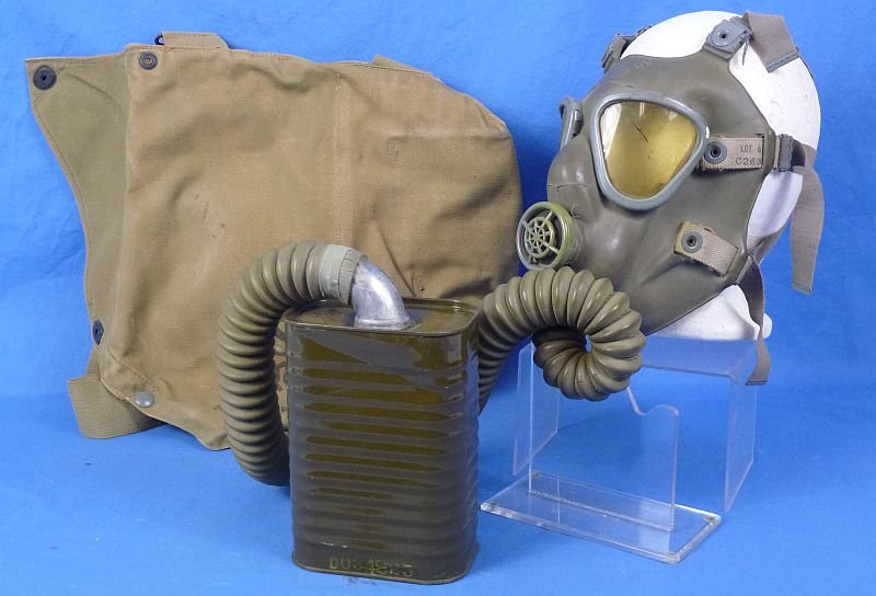 The gas mask and its carrying bag show expected signs of age and wear, but overall the set is in very good condition.