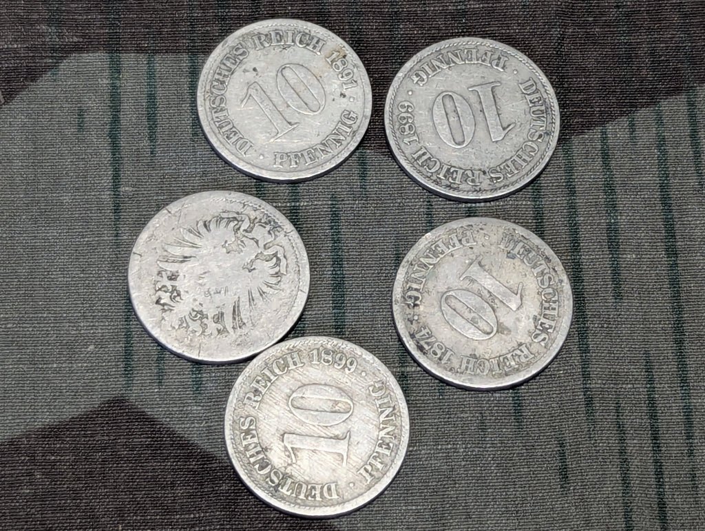Lot of 5 ten Reichspfennig coins from 1874-1899. All are in circulated condition. Some show wear, discoloration and oxidation. A few are very worn and its hard to make out the markings. Only one lot available, you will receive the exact coins pictured.