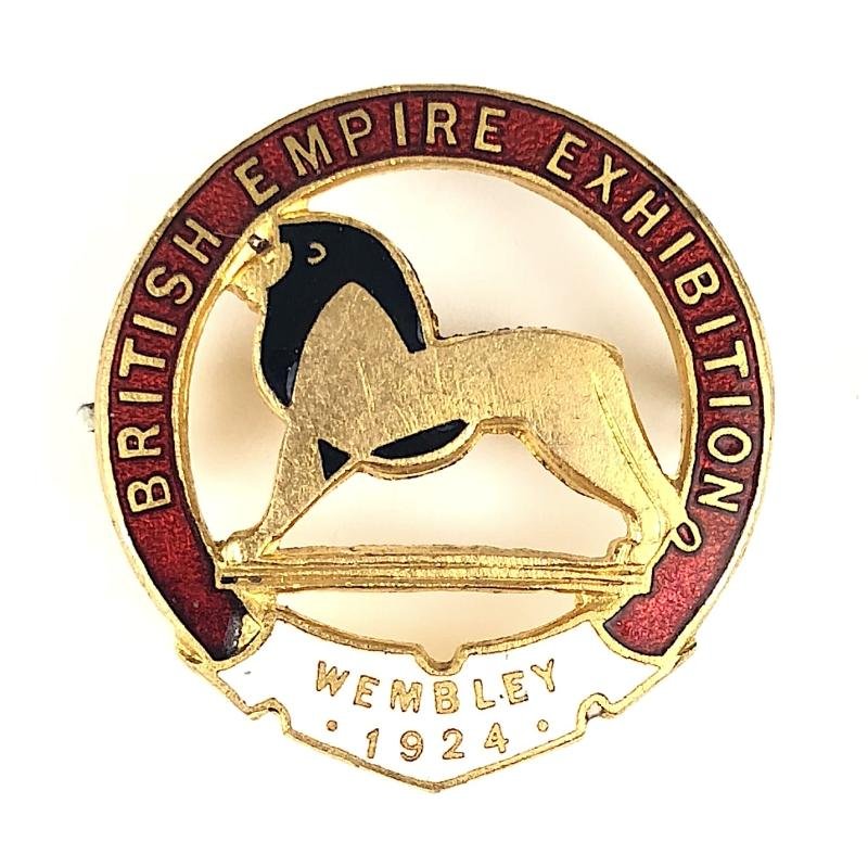 A scarce unusual 'British Empire Exhibition Wembley souvenir enamel pin badge' gilt brass example depicting the official 'Wembley Lion' symbol within a voided red enamel horseshoe title surround, joined at the base with white enamel 'Wembley 1924. Very good condition, complete with original pin fittings, no damage to the enamel, gilt finish remains bright, an excellent example.Height approx 27mm.