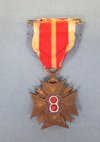 Original era manufacture. Early Veterans of Foreign Wars medal with an enameled 8th Corps emblem at center. Partial wrap brooch suspension, ribbon shows wear.