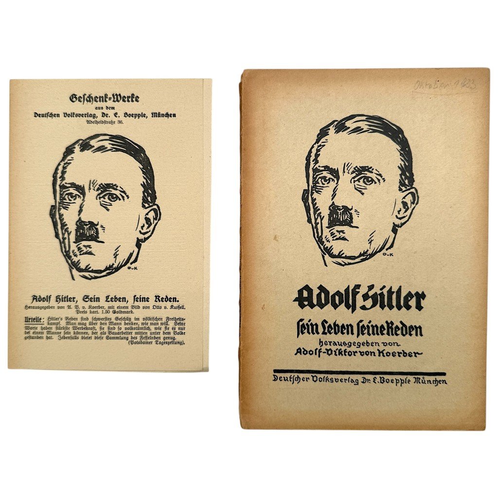 Original early German brochure with flyer from 1924 titled Adolf Hitler Sein Leben, seine Reden compiled by Adolf-Viktor von Koerber.This publication from Germany belongs to the early period of National Socialist propaganda and offers insight into the formative years of Hitler's public image.The brochure includes biographical texts and speeches accompanied by an inserted flyer advertising völkisch and antisemitic literature.Published by Deutscher Volksverlag in Munich, it reflects the political and social climate of the interwar period.The front and back cover and several pages are loose.A very rare collector's item of significant historical interest for collectors of early 20th century political printed material.Article number 18904Originele 1924 Duitse brochure Adolf Hitler Sein Leben – Adolf-Viktor von Koerber met flyerOriginele vroege Duitse brochure uit 1924 getiteld Adolf Hitler Sein Leben, seine Reden samengesteld door Adolf-Viktor von Koerber.Deze uitgave uit Duitsland behoort tot de vroege periode van nationaalsocialistische propaganda en geeft een inkijk in de beginfase van Hitlers publieke profilering.De brochure bevat biografische teksten en redevoeringen aangevuld met een bijgevoegde flyer met advertenties voor völkische en antisemitische literatuur.Het drukwerk is uitgegeven door Deutscher Volksverlag in München en weerspiegelt de politieke en maatschappelijke context van het interbellum.De voor- en achterkaft en enkele pagina's van de brochure zijn los.Zeer zeldzaam verzamelobject dat van grote historische waarde is voor verzamelaars van vroeg 20e-eeuws politiek drukwerk.