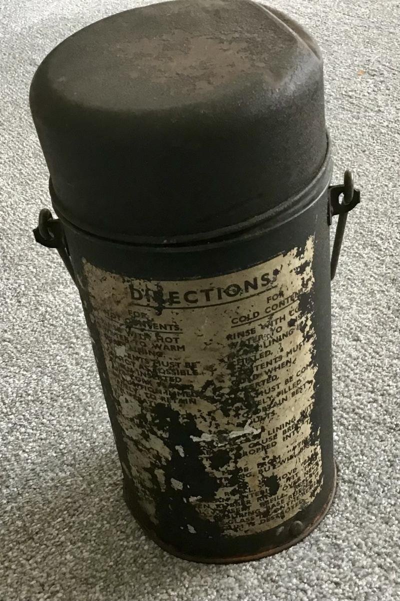 Believed to have been used in the Avro Lancaster Bomber, this 'Thermos' branded vacuum flask is complete with its cork sealant lid and its protective case which is maker marked and dated '1945' to the base.