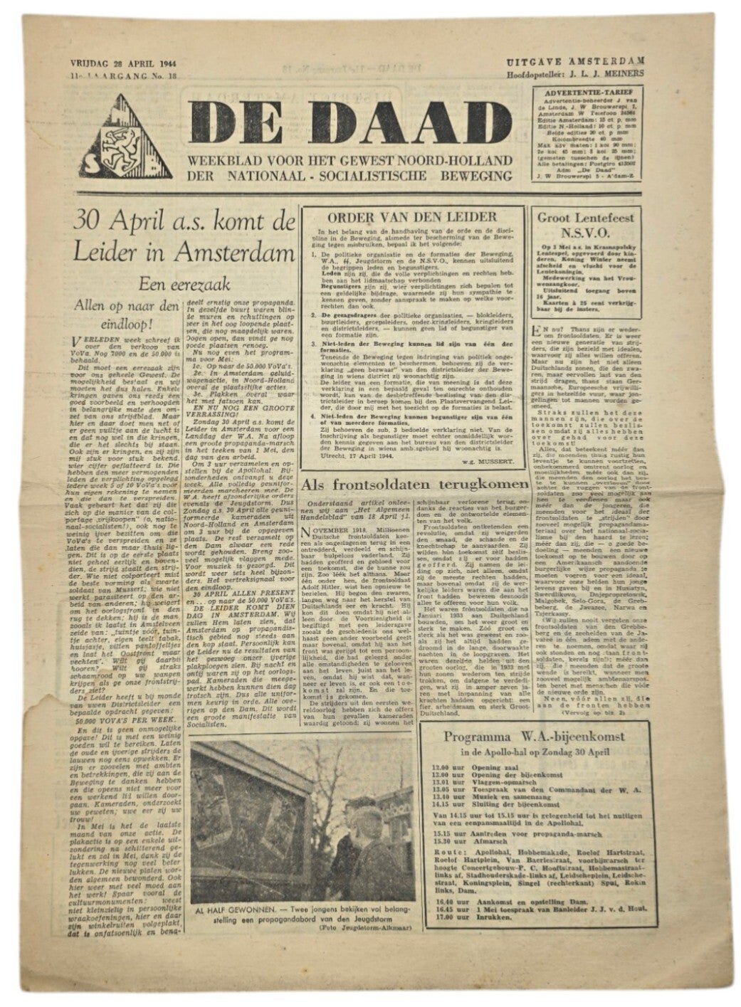 Original WW2 Dutch Collaboration NSB Newspaper - De Daad Amsterdam 11th year No. 18 (1944)NSB newspaper for North Holland.Originele WO2 Duitse Collaboratie NSB Krant - De Daad Amsterdam 11de Jaargang No. 18 (1944)NSB krant Noord-Holland.