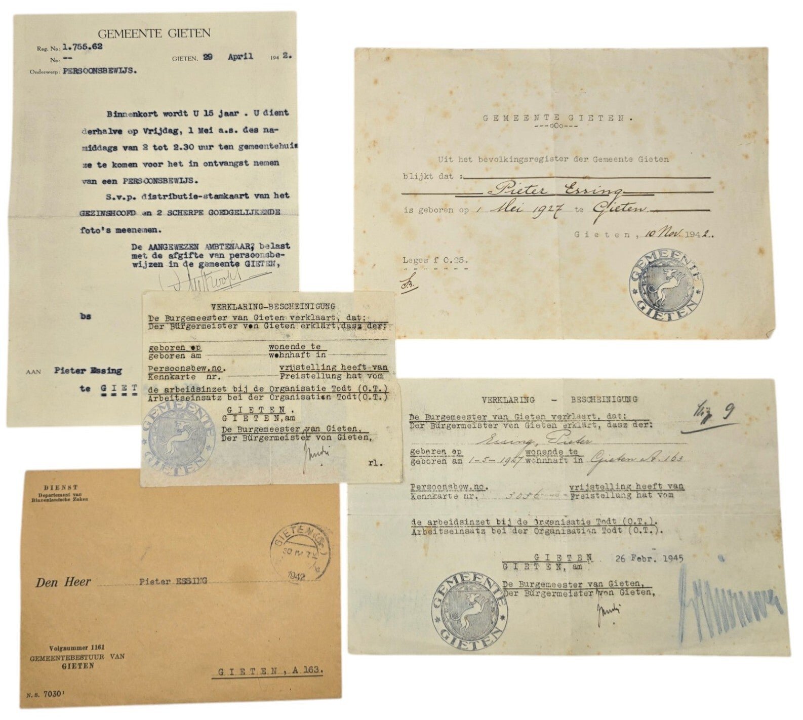 Original WW2 Dutch Document - Persoonsbewijs pickup and Bescheinigung set Gieten (1942 1945)Drenthe.Origineel Wo2 Nederlands Document - Persoonsbewijs oproep en Bescheinigung set Gieten (1942 1945)Drenthe.