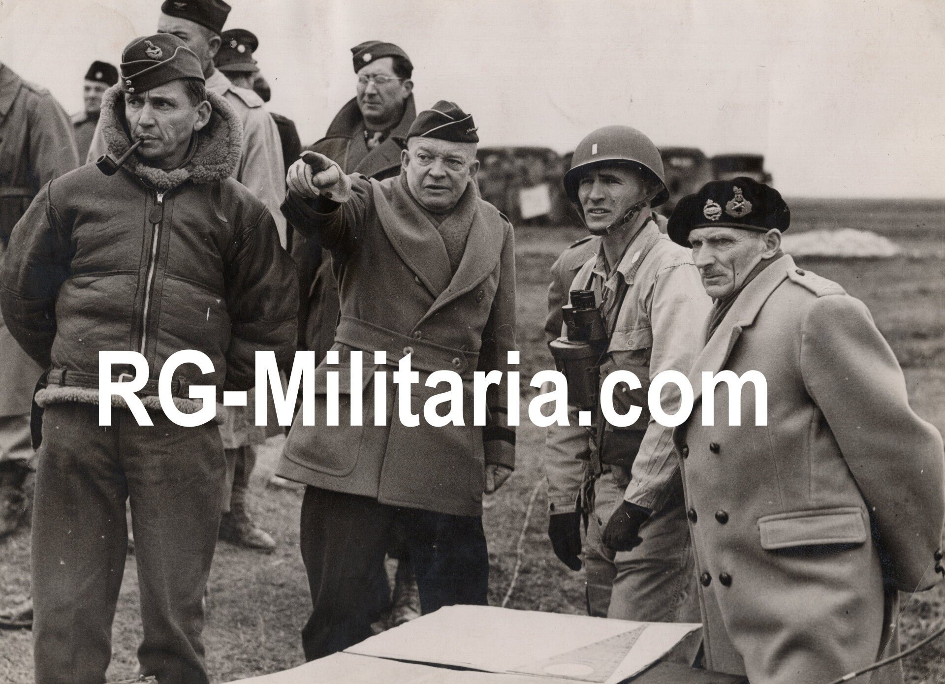 Original WW2 US Press Photo - General Dwight D. Eisenhower with General Bernard Montgomery discussing invasion plans (1944)Approximately 20 x 15 cmOriginele Wo2 Amerikaanse Persfoto -Generaal Dwight D. Eisenhower en generaal Bernard Montgomery bespreken invasieplannen (1944)Ongeveer 20 x 15 cm