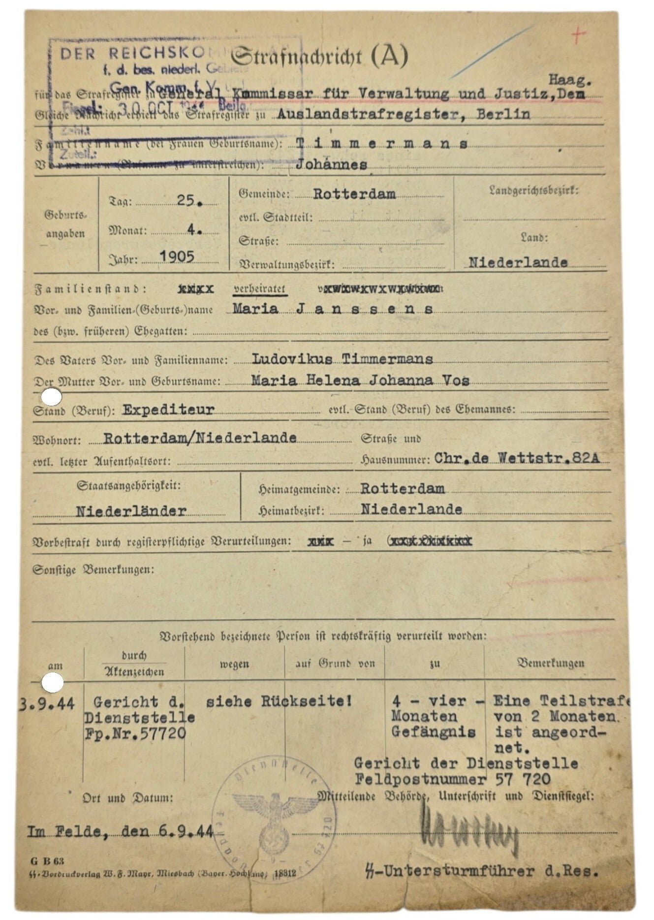 Original WW2 Dutch Waffen SS Document - Strafnachricht Rotterdam, Dutch Waffen SS soldier for stealing (1944)