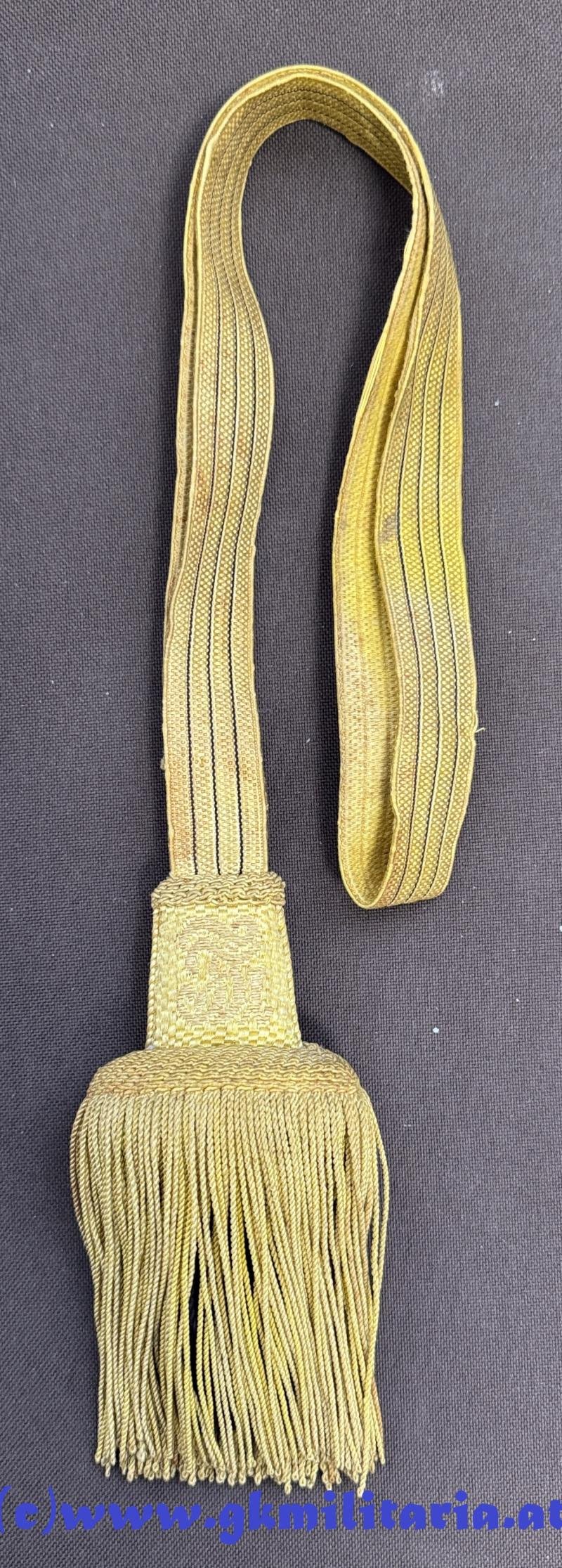 k.u.k. Portepee Säbel Kaiser Franz Joseph I. ! - für höhere Unteroffiziere - Variante mit langen Fransen - Band mit 3 schwarzen Durchzügen - auf der Vorderseite allerhöchster Namenszug 'FJ I.' für Kaiser Franz Joseph I. und auf der Rückseite 'Doppeladler'- Fransen aus kaisergelber und schwarzer Wolle - sehr guter gebrauchter Zustand!