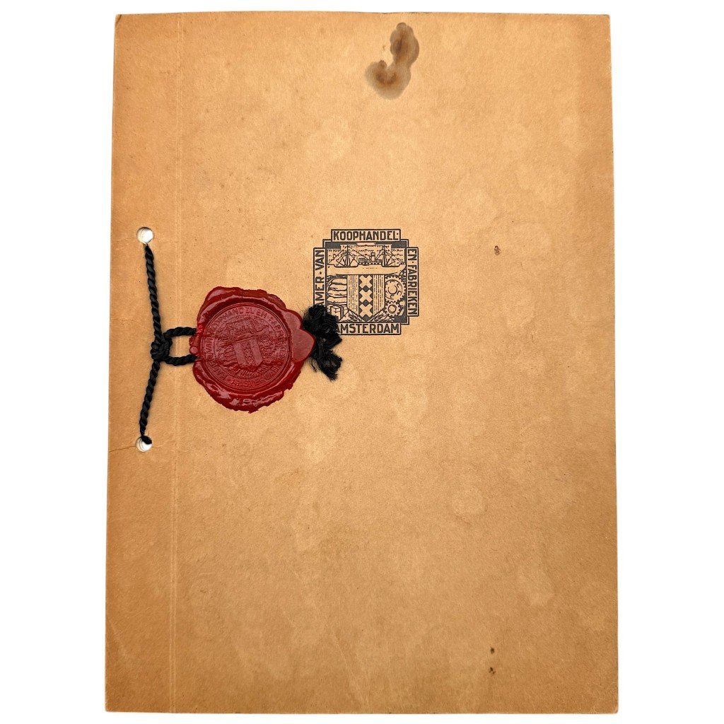 This original Dutch Chamber of Commerce file of Maison de Bonneterie documents a company archive dating from 1921 to 1941 and reflects the history of a well-known Amsterdam department store.The file originates from Amsterdam and contains official registrations and amendments recorded at the Chamber of Commerce and Industry in Amsterdam.Maison de Bonneterie, owned by the Jewish Cohen family, was located at Kalverstraat 183 in Amsterdam and also operated a branch in The Hague.The documents include several dated entries such as July 8, 1921, April 27, 1923, June 29, 1937 and May 28, 1941.The file outlines the company's activities as a retail business specializing in women's, girls' and boys' clothing, hosiery and related goods.Of particular historical importance is the entry dated May 28, 1941 referring to the decree of the Reich Commissioner of March 12, 1941.This entry marks the forced aryanization and confiscation of the Jewish-owned business during World War II in the Netherlands.The Cohen family managed to escape during the occupation via Paris, Portugal and Cuba to New York.During the war the business at Kalverstraat 183 was dismantled and looted under German control and many employees were affected.A total of 68 employees of the company did not survive the war.After liberation on May 5, 1945 the staff regained control of the building at Kalverstraat 183 and resumed operations.Article number: 18933