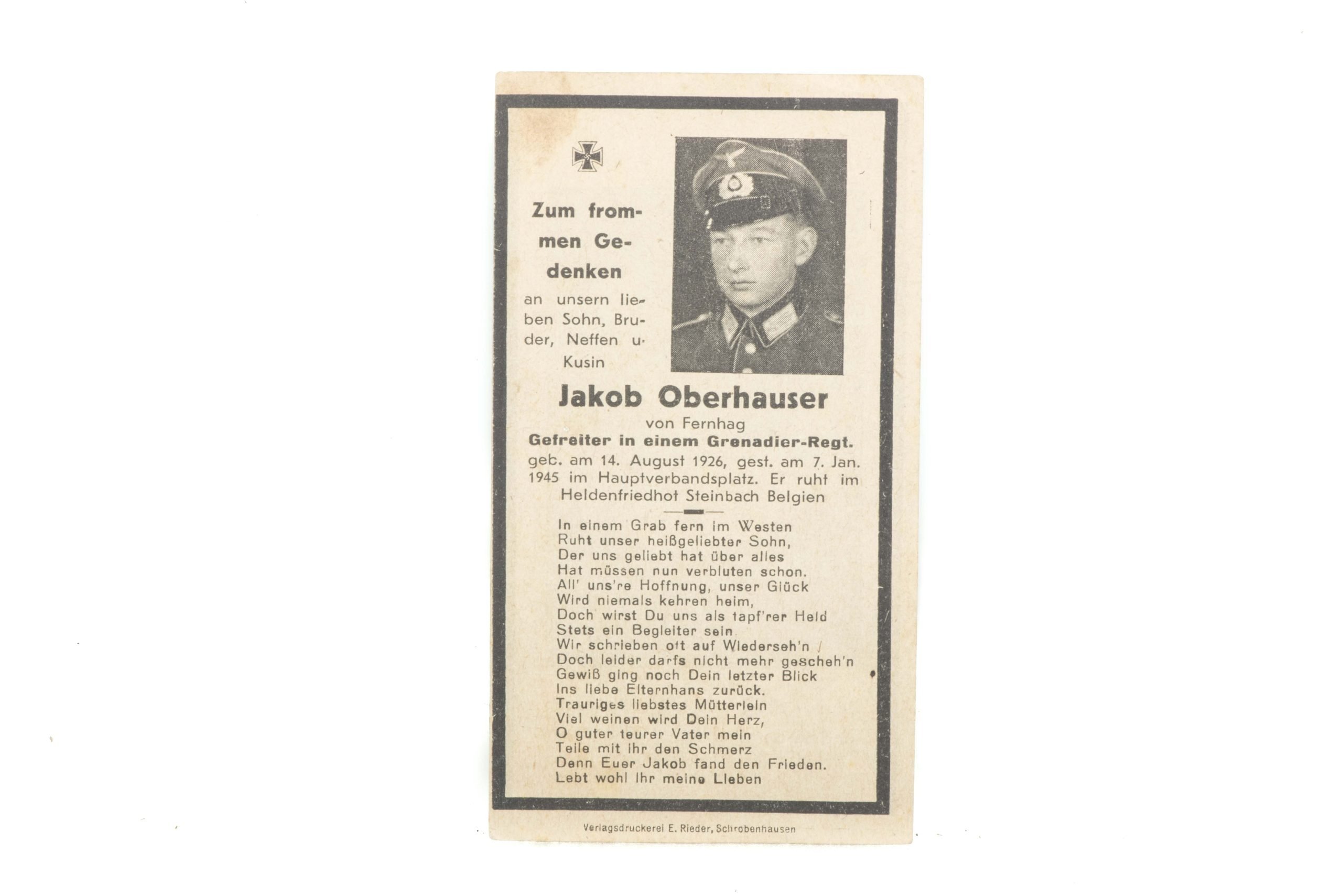 Deathcard Jakob Oberhauser KIA 07.01.45 Steinbach