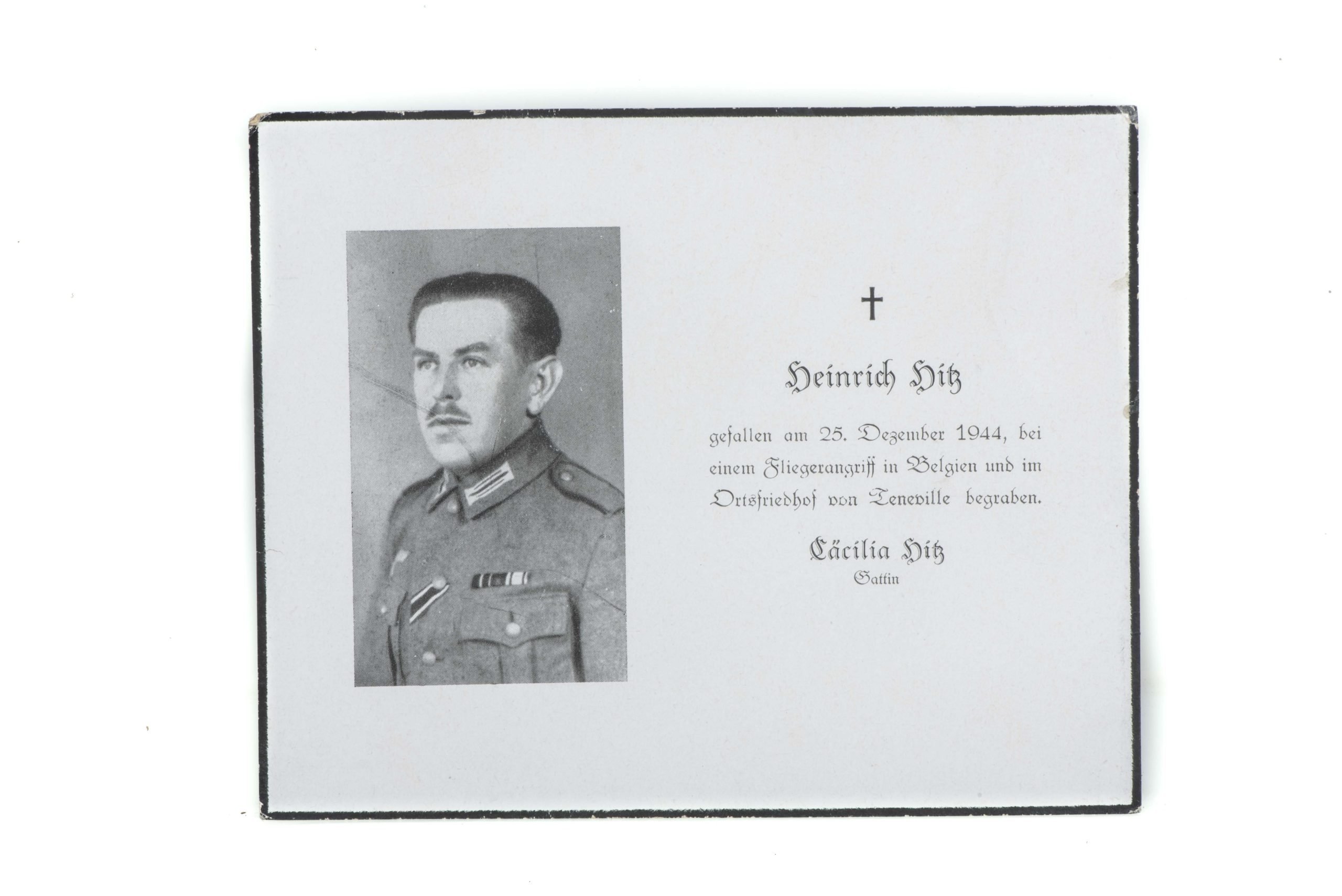 Deathcard Stabsgefreiter Heinrich Hitz was killed in action 25.12.44 Belgium Leneville which is probably Luneville between Nancy and Strassbourg.Heinrich Hitzruht auf der Kriegsgräberstätte inLommel.Endgrablage: Block 2 Grab 177