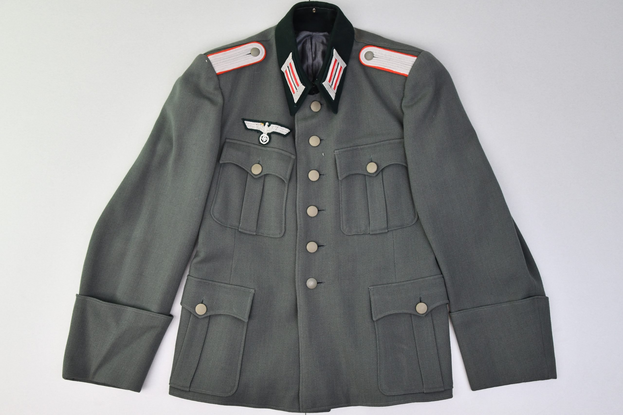 German M36-style officer's tunic, a well-executed period-style remade example in a beautiful, rich field-grey gabardine wool. The tunic is complete with all insignia properly sewn on, featuring red Waffenfarbe for artillery and the rank of Leutnant. The original breast eagle is fully intact and originally sewn; however, the stitching around the swastika is missing, as it was once folded underneath the body of the eagle post-war to conceal it. The swastika has since simply been unfolded back into its correct position, and the eagle remains nicely in place despite the absent stitching in that specific area.Upon inspection, there is some minor wear visible: a small area of damage behind the buttons when the tunic is opened, as well as two small holes on the reverse of the right sleeve. These are not moth holes but rather minor storage or handling damage. Overall, the tunic remains in excellent, near unworn condition, with strong color, no fading, and all buttons intact. The buttons are the typical officer type with solid backs and are marked 'JFS,' a known maker, dated1943, which aligns well with the mid-war construction of the tunic.The interior does not have a tailor label, but the lining is well finished in typical officer quality. The dagger hanger is still present and marked DRGM. All in all, this is a very honest and attractive tunic, ideal for a mannequin display and perfectly suited for a combat or field officer setup.