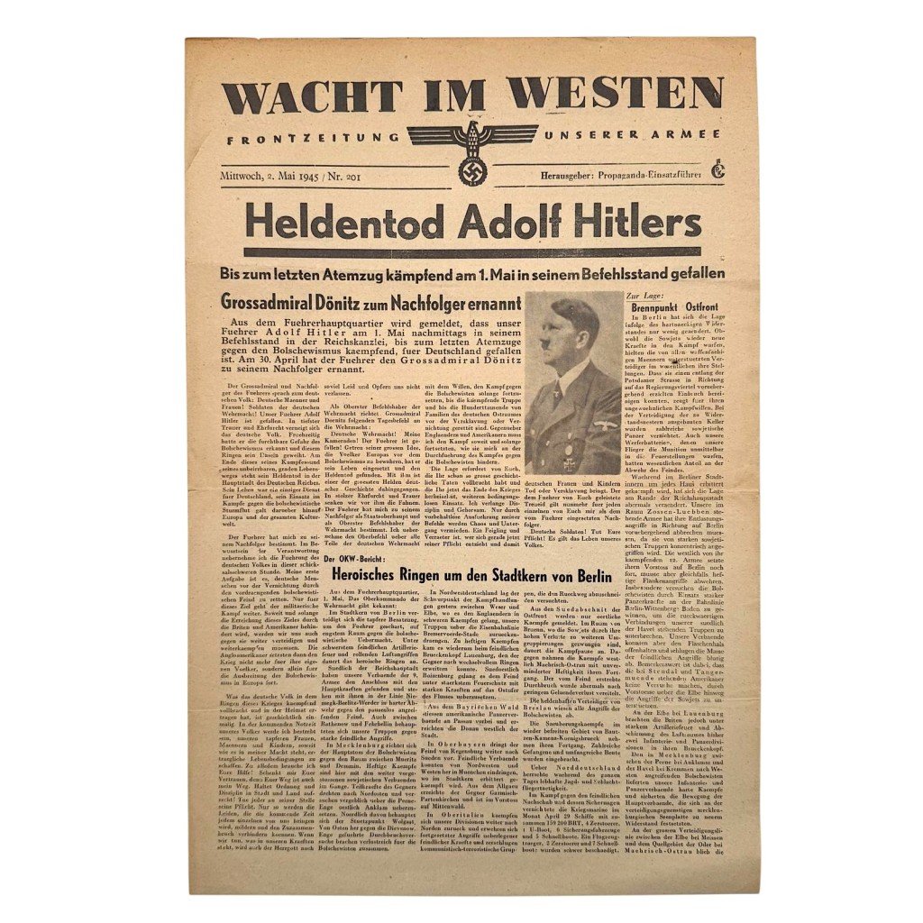 Original WWII German newspaper 'Wacht im Westen' with death of Adolf Hitler – May 2, 1945