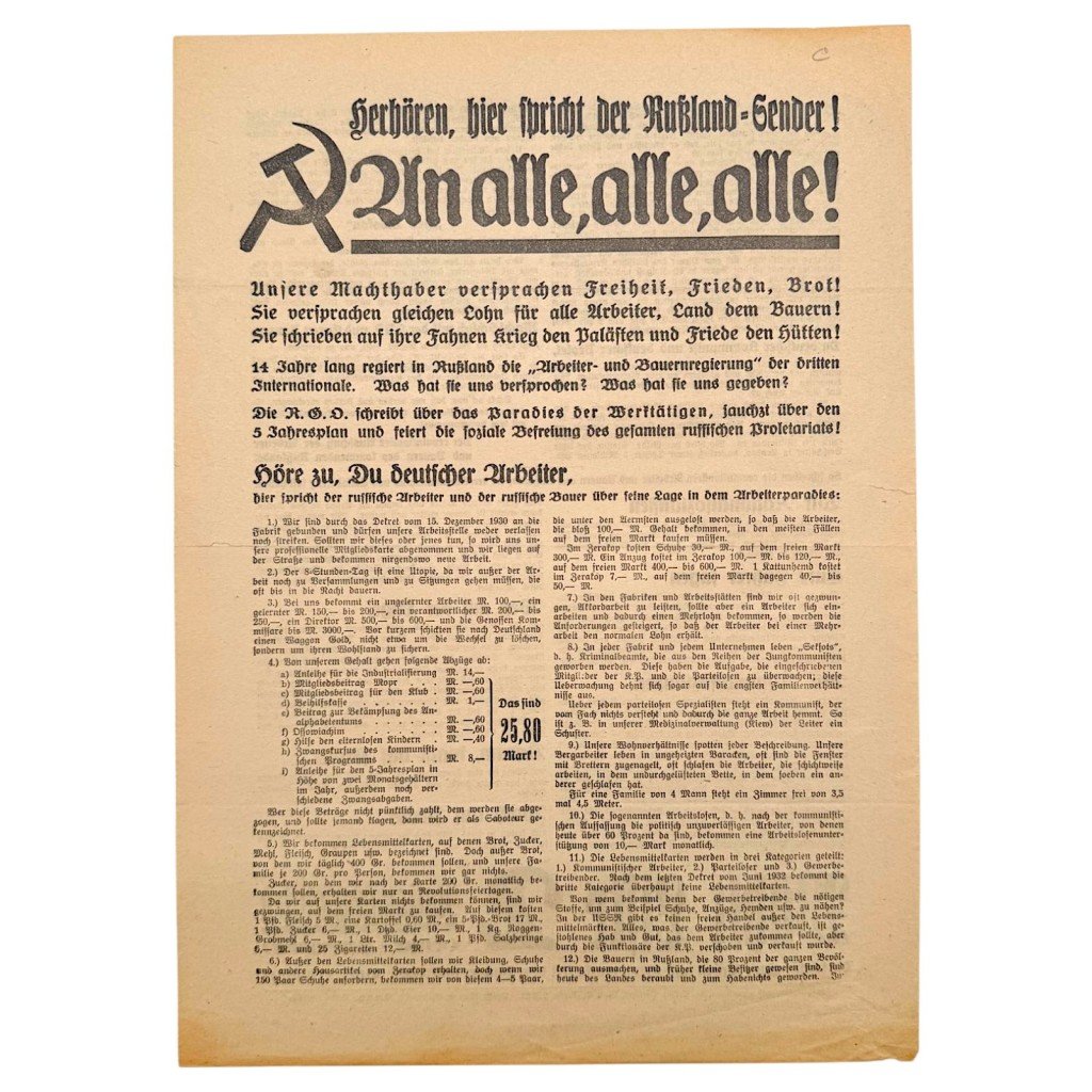 Original rare German NSDAP flyer from 1932 originating from the period of the Weimar Republic.This election flyer was distributed in the run-up to the elections and contains clear political propaganda aimed at workers and voters.The text strongly focuses on opposition to communism and attempts to persuade the reader of the NSDAP's viewpoints.On the front the call 'Wählt Liste 2' is prominently visible referring to the electoral list of the National Socialist party.The flyer features extensive text sections with political arguments and propaganda from this turbulent period in Germany.This document is an original piece of historical printed material and represents a tangible example of election propaganda from 1932.A collector's item for collectors of political history and World War II related memorabilia.Article number: 18988Originele 1932 Duitse NSDAP vroege verkiezingen flyerOriginele zeldzame Duitse NSDAP flyer uit 1932 afkomstig uit de periode van de Weimarrepubliek.Deze verkiezingsflyer werd verspreid in aanloop naar de verkiezingen en bevat duidelijke politieke propaganda gericht op arbeiders en kiezers.De tekst richt zich sterk tegen het communisme en probeert de lezer te overtuigen van de standpunten van de NSDAP.Op de voorzijde is prominent de oproep 'Wählt Liste 2' zichtbaar wat verwijst naar de kieslijst van de nationaalsocialistische partij.De flyer bevat uitgebreide tekstblokken met politieke argumentatie en propaganda uit deze turbulente periode in Duitsland.Dit document is een origineel stuk historisch drukwerk en vormt een tastbaar voorbeeld van verkiezingspropaganda uit 1932.Een bijzonder verzamelobject voor verzamelaars van politieke geschiedenis en Tweede Wereldoorlog gerelateerde memorabilia.