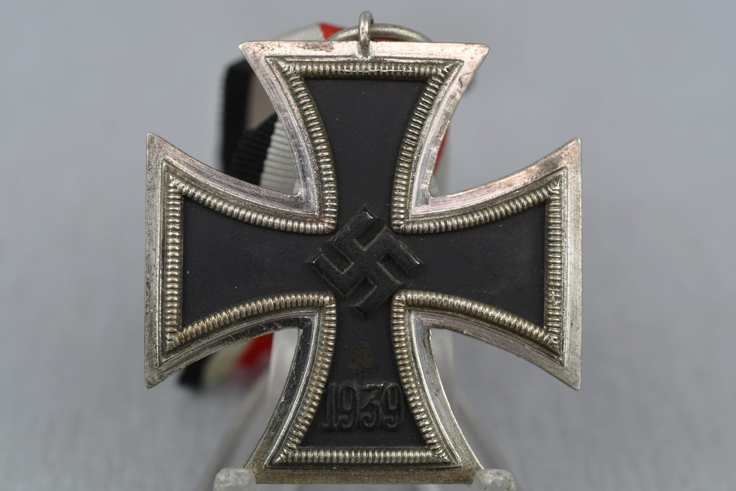 Genuine WW2 Iron Cross 2nd class in very good condition with original ribbon. Silver 2 piece frame with a steel, black coated core. Unmarked example made by Julius Maurer, nr.75.