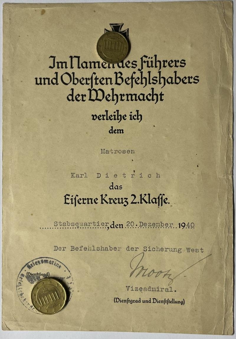 EK II citation of 'Matrosen' Karl Dietrich who servedunder command of 'Der Befehlshaber der Sicherung West' which covered mainly the French coast.The document has been signed by 'Der Befehlshaber der Sicherung West' Hermann Mootz (DKiS 5-3-1943) in the rank of 'Vizeadmiral'.
