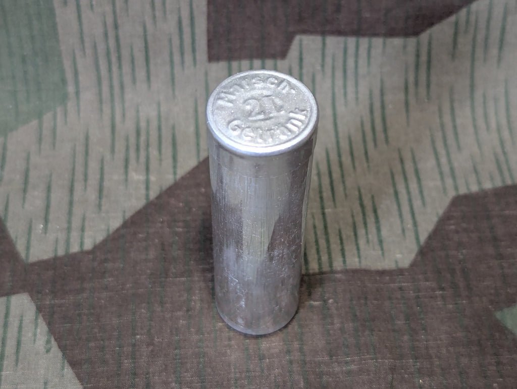 At long last, a reproduction of the Wehrmacht aluminum drink powder tubes, Marsch Getränk. Each tube would have held enough drink mix to make 2L of drink. This was essentially the electrolyte powder of its era provided to men on long marches. I made these from an aluminum tube that was extremely close to the original in size, These are a couple millimeters longer than the original, but the diameter is nearly exact.I am selling the tube empty for a few reasons; firstly you can find your own preferred drink powder flavor to fill it with (although I believe the original was lemon flavored) and secondly, these tubes are not coated inside, they are just bare aluminum. This means that storing salt-heavy electrolyte powder in them for long periods might eat away the tube, as was a pretty common occurrence on originals. You will be fine refilling these tubes for a weekend reenactment, but it would be best to store them clean and empty when not at an event. Like the original, these are made from relatively thin aluminum. They will hold up well in most conditions but can be crushed if abused. The lids slip on and off. All fit snugly and some fit tighter than others, but all are reasonable easy to remove with a gentle touch. I wanted to ensure the lids would not be too loose and easily fall off, but that also means they might be just a little bit tight to open. At least they won't leak.This is a project that I intended to make many years ago but it was only recently I figured out a way of resizing the lids and pressing in the markings in a way that produced a good result. The markings are not quite as crisp as an original, but they are very close. Each lid has to go through 4 separate stamping operations to size and mark. This might be the only batch I make so there might not be a restock unless there in enormous demand for them but I am fairly sure I just made these because I wanted them and am not sure anyone else is as jazzed about this as me.