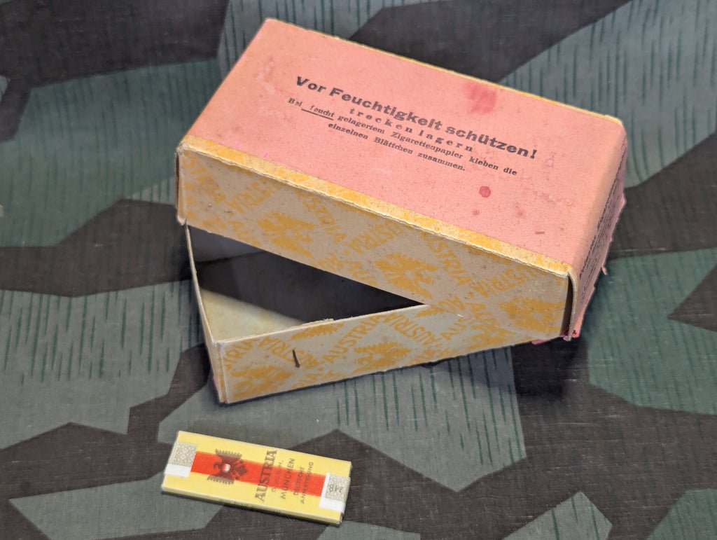 Original Austria brand box for cigarette rolling papers with 1 original rolling paper packet. The packet has a prominent Reichsadler embossed in it. In good condition.The rest of the rolling papers aresold individually here.