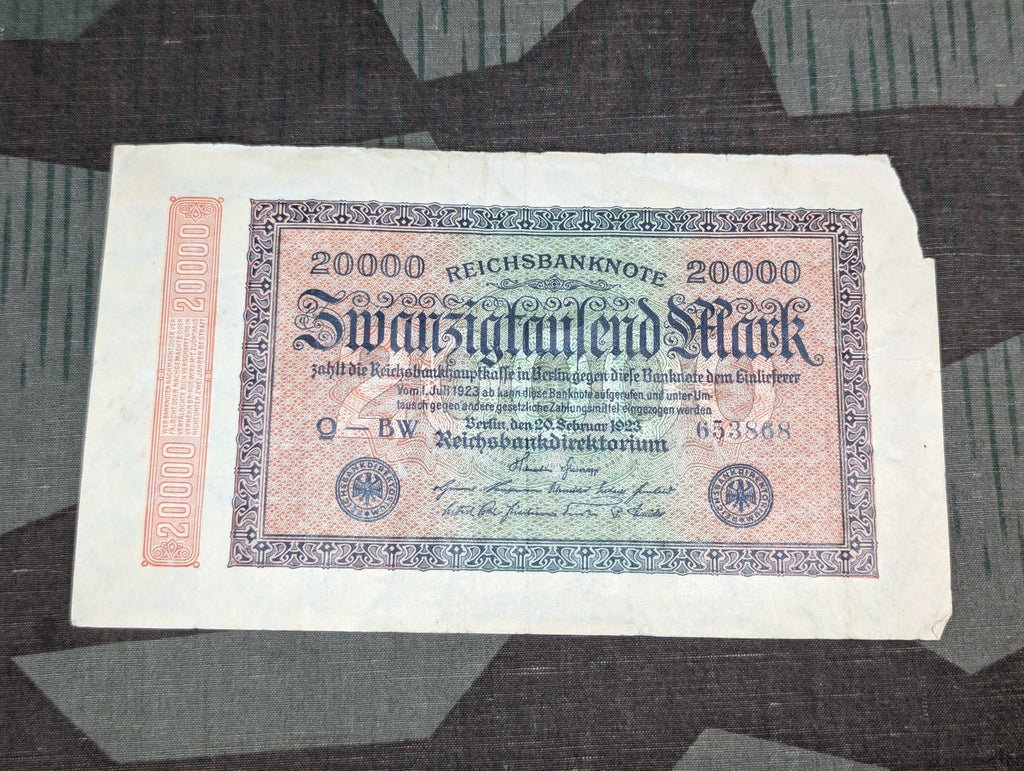 Original Reichsbanknote for 20,000 marks. 1923 Weimar inflation money. Circulated with some damage around the edges, fairly clean looking overall.