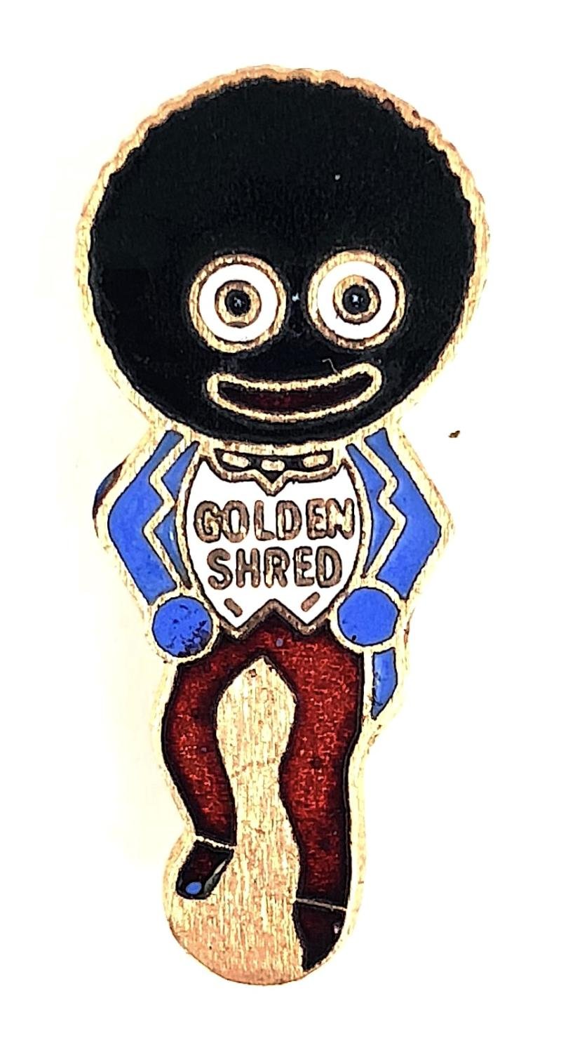 A scarce original circa 1950's period 'Robertson's Standard Golly badge' wearing red bow tie, white waistcoat with pockets, displaying the advertising slogan 'Golden Shred', the reverse stamped in relief with maker's details 'JR Gaunt B'Ham'. Very good condition, complete with original pin fittings, no stress marks or damage to the enamel.Height approx 33mm.