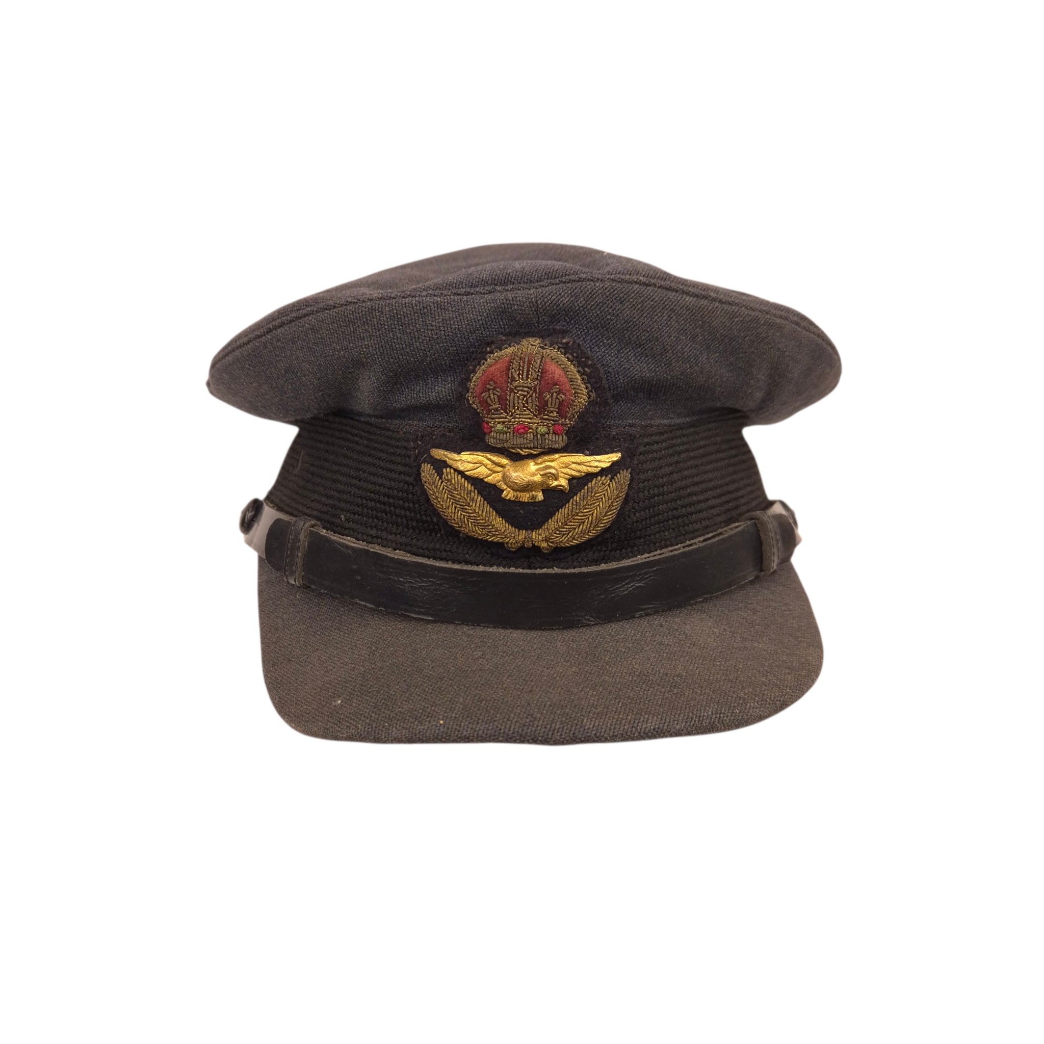 Original WWII Royal Air Force (RAF/RCAF) Warrant Officer, service dress cap. The cap is complete with King's Crown RAF/RCAF Warrant Officer cap badge. The cap is in nice field worn condition.