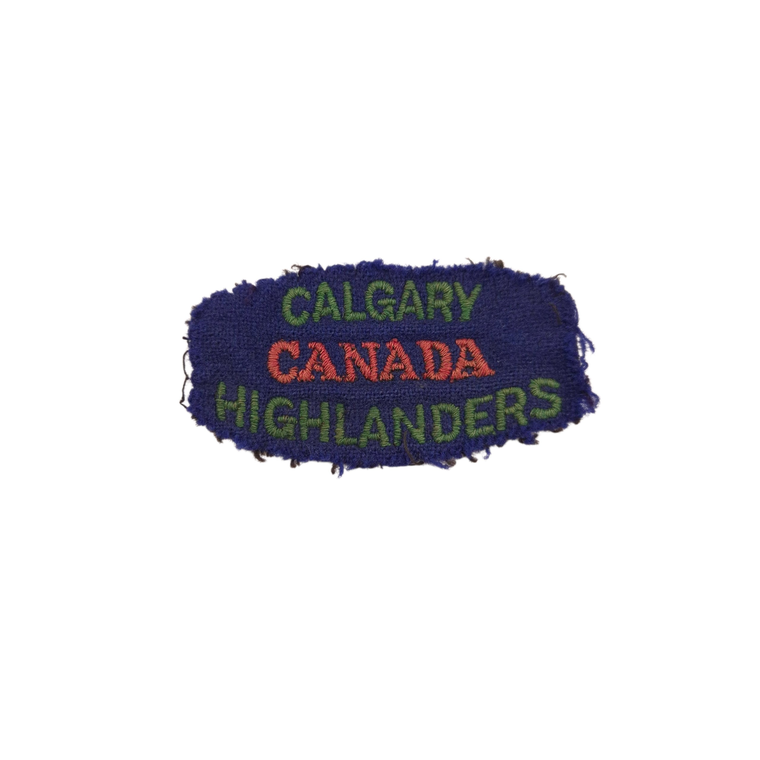 Original WWII Calgary Highlanders of Canada embroidered shoulder title in uniform removed condition. This is a nice wartime Canadian made shoulder title. The Calgary Highlanders of Canada were part of the 2nd Canadian Infantry Division.