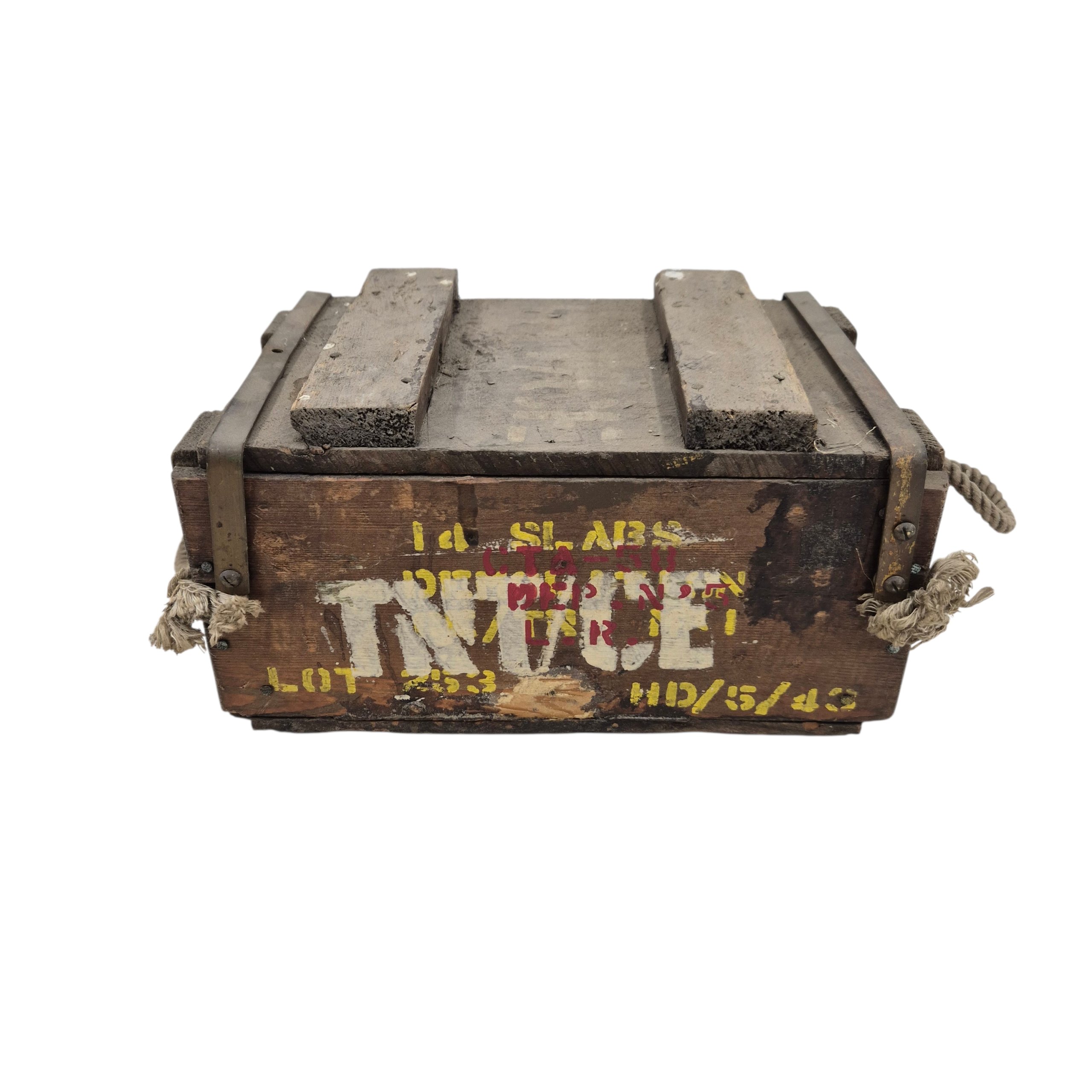 Original WWII British CE/TNT MkI wooden crate. The empty crate is dated May 1943, originally contained 14 'slabs' of CE/TNT MkI, which were issued to Demolition/Royal Engineer teams and also used by resistance and SOE. The CE (Composition Exploding) was apparently an integral fuse primer to detonate the TNT. The crate/box is 30cm long, 19cm wide and 16cm tall and very well-marked on all sides. The crate/box is in used condition. It has no cotter pin locks present. One side shows possible Belgian postwar depot markings in red.