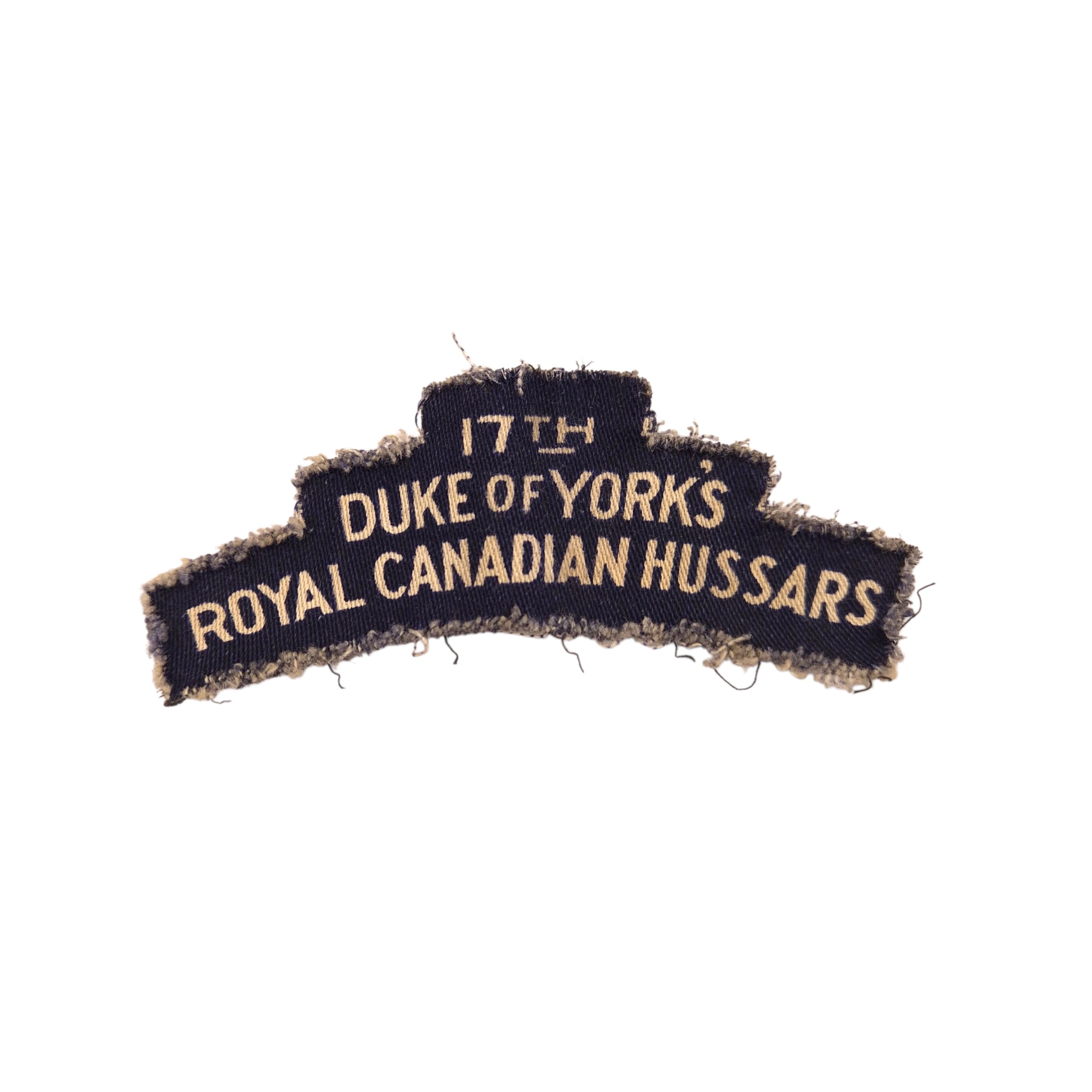 Original WWII 17th Duke of York's (Royal Canadian Hussars) printed shoulder title in uniform removed condition. English made canvas example for Canadian troops overseas. Backing is missing. The 17th Duke of York's Regiment was part of the 3rd Canadian Infantry Division.