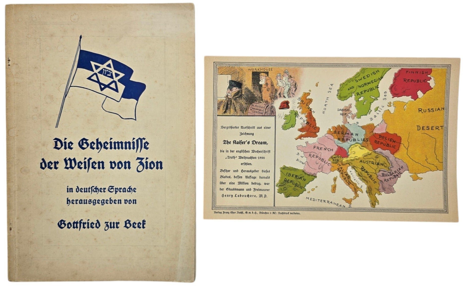 Original WW2 German Antisemitic Brochure - Die Geheimnisse der Weisen von Zion, Gottfried zur Beek with rare add-on (1935)