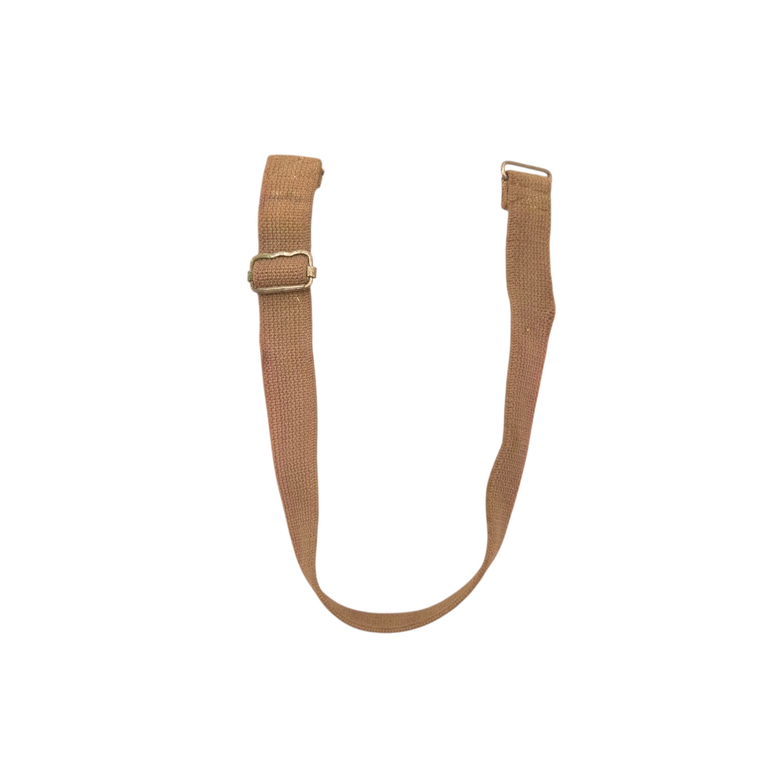 Original WWII British MkIII helmet chinstrap, produced from 1943. It still retains the original red-brown factory color and remains in unused, fully elastic condition. A hard to find piece. Perfect for completing your helmet. This chinstrap type was also used on some MkII helmets.