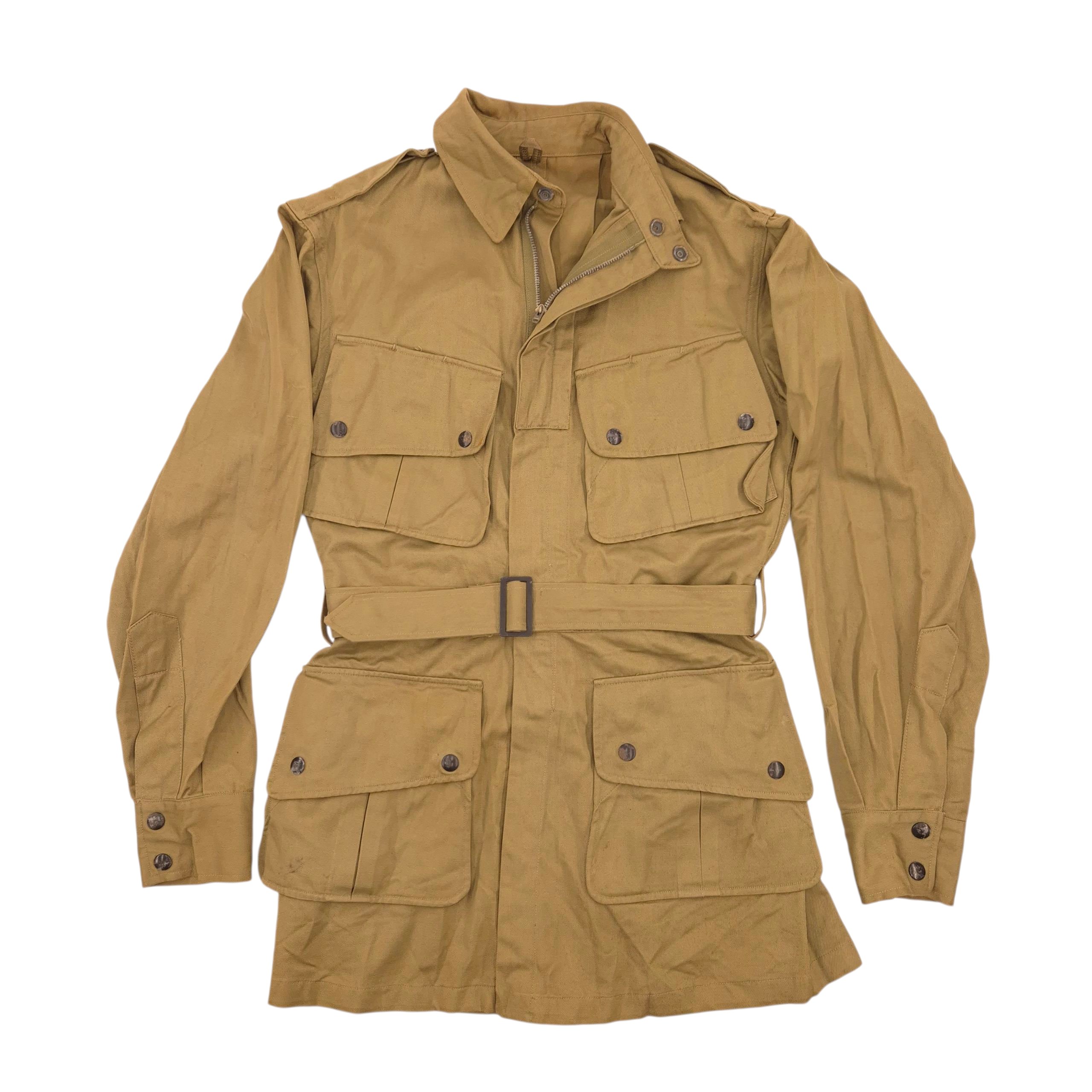 Original WWII U.S. Airborne M1942 Jump Jacket in very good condition. Well-known worn by members of the 101st Airborne Division during D-Day in Normandy and Operation Market Garden. Both zippers are present and functional, large zipper is made by Crown USA, and all original press studs work. The often-missing waist belt is intact. The jacket features a clear, readable maker's label from Sigmund Eisner Co, dated April 1943, size 36L, a desirable size. Hard to find in this condition!