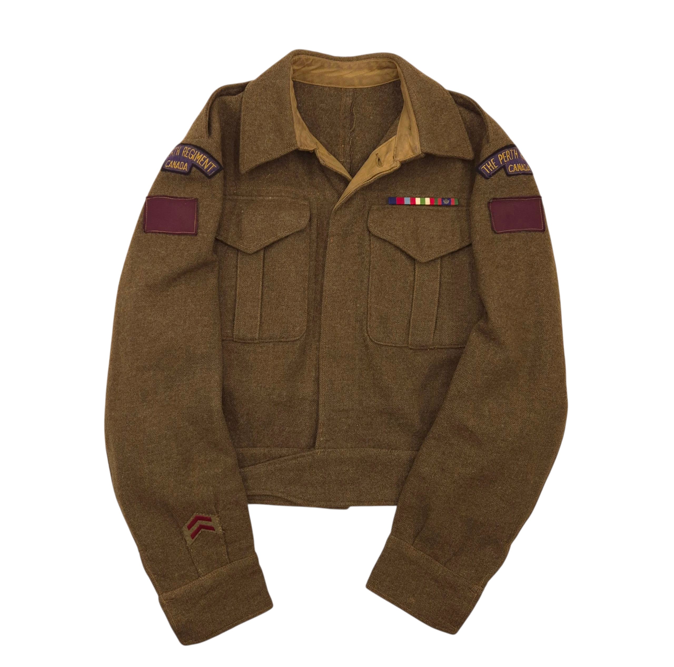 Original WWII Perth Regiment battle-dress jacket. An excellent example of an original battle dress jacket to the Perth Regiment. This jacket features a rare pair of I.O.D.E.-made embroidered shoulder titles. It shows normal signs of wear consistent with age and service use. The jacket is maker-marked S. Stall & Son Ltd., Winnipeg, and dated 1944, size 11. All insignia are original and period-applied, including: A pair of I.O.D.E.-made embroidered Perth Regiment shoulder titles, printed 5th Canadian Armoured Division formation patches, two years' service chevron and medal ribbon.The Perth Regiment I.O.D.E. made shoulder titles. The government had done some earlier testing with the printed titles to ascertain their longevity. It was found that the printed variety tended to fade over time and was more likely to curl at the edges with wear. Cloth embroidered titles tended to be more popular with the men and these would often be seen on their best or walking out uniforms. One of the first of these titles to make its way overseas was courtesy of the Stratford chapter of the IODE (Imperial Order Daughters of the Empire). As a sign of supporting their regiment overseas, they raised money to have shoulder flashes made and sent to the unit.