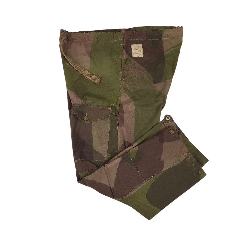 Original WWII pair of British Trousers, Windproof Camouflaged. The camouflage windproof suits were made from the same lightweight, windproofed cotton material used for the drab tan sets. The camouflage pattern is similar to that of the Denison smock, sharing the same base colours and brushstroke style. This pair of trousers is in good condition with no damage. It retains its original maker's label: John Gordon & Co, dated 1943, size 7. The first camouflage windproof suits were introduced in 1943. Draw tapes are present.