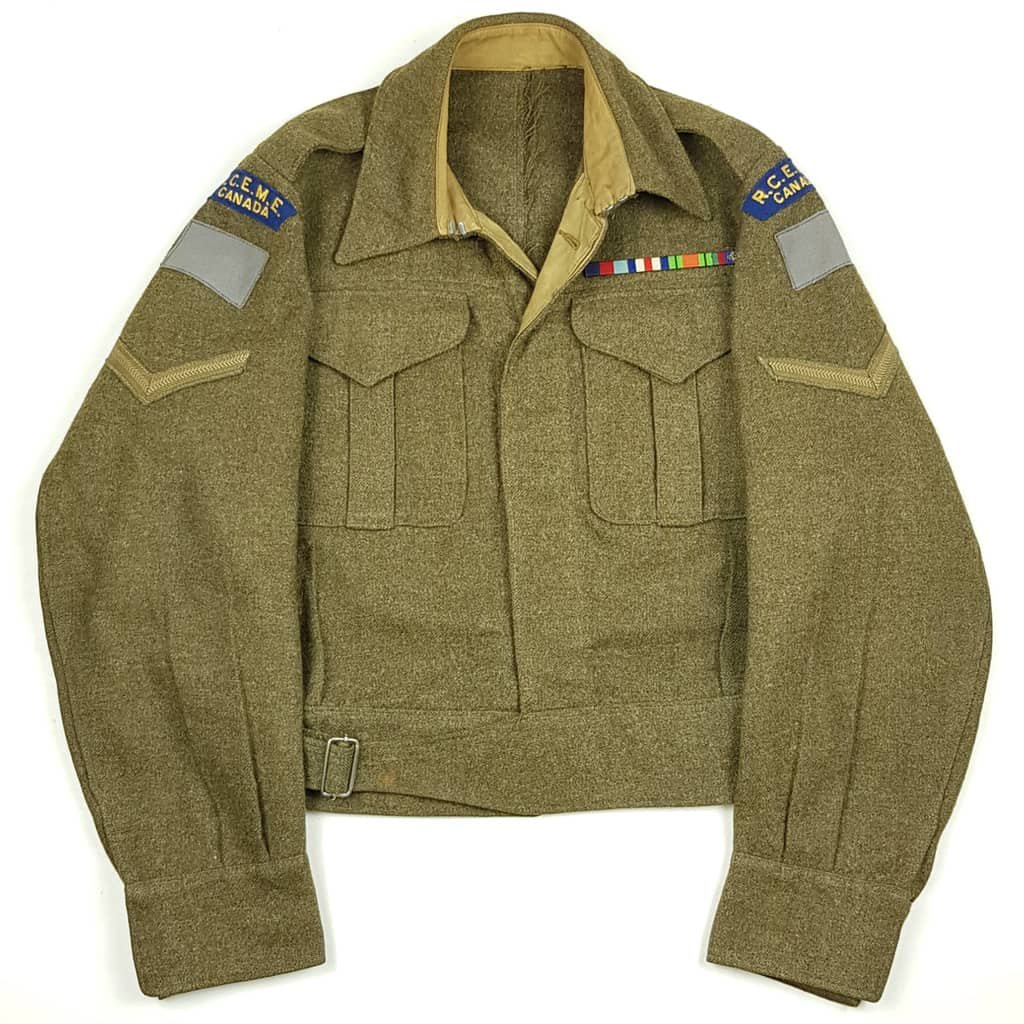 Original WW2 Canadian Battledress named to Corporal H.E. Schlievert, Cpl. Schlievert served with the Royal Canadian Electrical Mechanical Engineers (RCEME) in 3rd Canadian Infantry Division. The tunic is in good used condition, shows normal traces of usage. The tunic is having embroidered shoulder titles and division patches with his medal ribbons. Nicely maker marked and dated 1943, good size 7. Hard to find named 3rd Canadian Infantry Division tunic! Potential research project, we haven't done any research to Cpl. Schlievert.