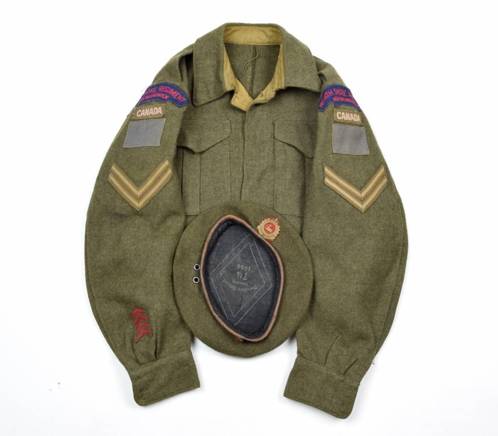 Battledress of the North Shore Regiment (D-Day)This is an original battledress with beret to a Corporal in the North Shore Regiment – 3rd Canadian Infantry Division. The tunic is in good condition. The tunic bears printed/canvas shoulder titles, CANADA titles and division patches. Embroidered Corporal chevrons and four years overseas stripes. Nicely maker marked by Tip Top Tailors, dated 1942 with size 8. The shoulder boards having the early brown chocolate coloured buttons. The beret is in good condition with its original capbadge with backing, maker marked and dated 1944. The North Shore Regiment took part in the first wave on D-Day June 6th 1944. Newsreel footage of the North Shore Regiment landing under fire taken by the Canadian Army Film and Photo Unit became one of the most-used film depiction's of the Allied D-Day landing.Details of The North Shore (New Brunswick) Regiment were called out on service on 26 August 1939 and then placed on active service on 1 September 1939 as The North Shore (New Brunswick) Regiment for local protection duties. The details called out on active service were subsequently disbanded on 31 December 1940.The regiment mobilized The North Shore (New Brunswick) Regiment, CASF for active service on 24 May 1940. It was redesignated as the 1st Battalion, The North Shore (New Brunswick) Regiment, CASF on 7 November 1940. It embarked for Great Britain on 18 July 1941. On D-Day, 6 June 1944, it landed on JUNO Beach in Normandy, France, as part of the 8th Infantry Brigade, 3rd Canadian Infantry Division, and it continued to fight in North-West Europe until the end of the war.During the Second World War, the regiment was first stationed in Woodstock, New Brunswick and then Sussex, New Brunswick. When it shipped overseas, it was initially stationed in Liverpool, after that it moved to Scotland near the castle of the Duke of Argyll.On June 6, 1944, the regiment participated in the landing on Juno Beach, landing on Nan Red sector and losing nearly 50 men. On June 10, it liberated the town of Saint-Aubin-sur-Mer, Calvados. Newsreel footage of the North Shore Regiment landing under fire taken by the Canadian Army Film and Photo Unit became one of the most-used film depiction's of the Allied D-Day landing.On July 4, 1944, the men of the North Shore Regiment participated in Operation Windsor, the attack on the Carpiquet airfield. It lost nearly 130 men, and it was later known by the regiment's chaplain as the 'graveyard of the regiment'. The regiment later fought in Caen and all through France, continuously advancing with the 8th Canadian Infantry Brigade. It fought in places like Ranville, Bourguebus Ridge, Falaise, Quesnay Wood, the Laison and Chambois.It helped clear the coast of France in late August and early September 1944, then it advanced into the Netherlands, taking part in the Battle of the Scheldt. It fought in Breskens Pocket in flooded fields and harsh conditions. After the Scheldt, it moved onto the rest of the Netherlands, fighting near the Bergsche Maas River at Kapelsche Veer.In February 1945, it moved into Germany via amphibious landing. It fought in the Rhineland, the Hochwald, but then it doubled-back to the Netherlands and conquered the Twente Canal, and liberated Zutphen where it met its most brutal urban fighting since Caen. It then moved back into Germany in April, and it ended the war on German soil.A rare uniform set to the North Shore Regiment!!