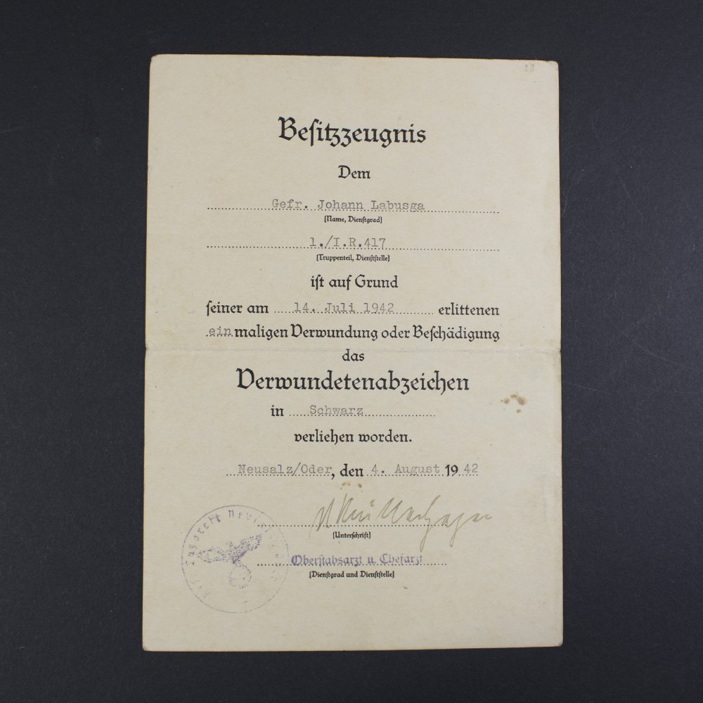 About the item: Nice and still in a good condition award document for the black wound badge, About the Wound Badge: The Wound Badge (German: Verwundetenabzeichen) was a German military decoration first established by Emperor Wilhelm II on March 3, 1918. It was originally awarded to soldiers of the German Army who sustained injuries during World War I. Between the two world wars, the badge was also awarded to members of the German armed forces who fought for the Nationalist side in the Spanish Civil War (1938–1939) and received combat-related wounds. Click HERE for more info about the Wound Badge