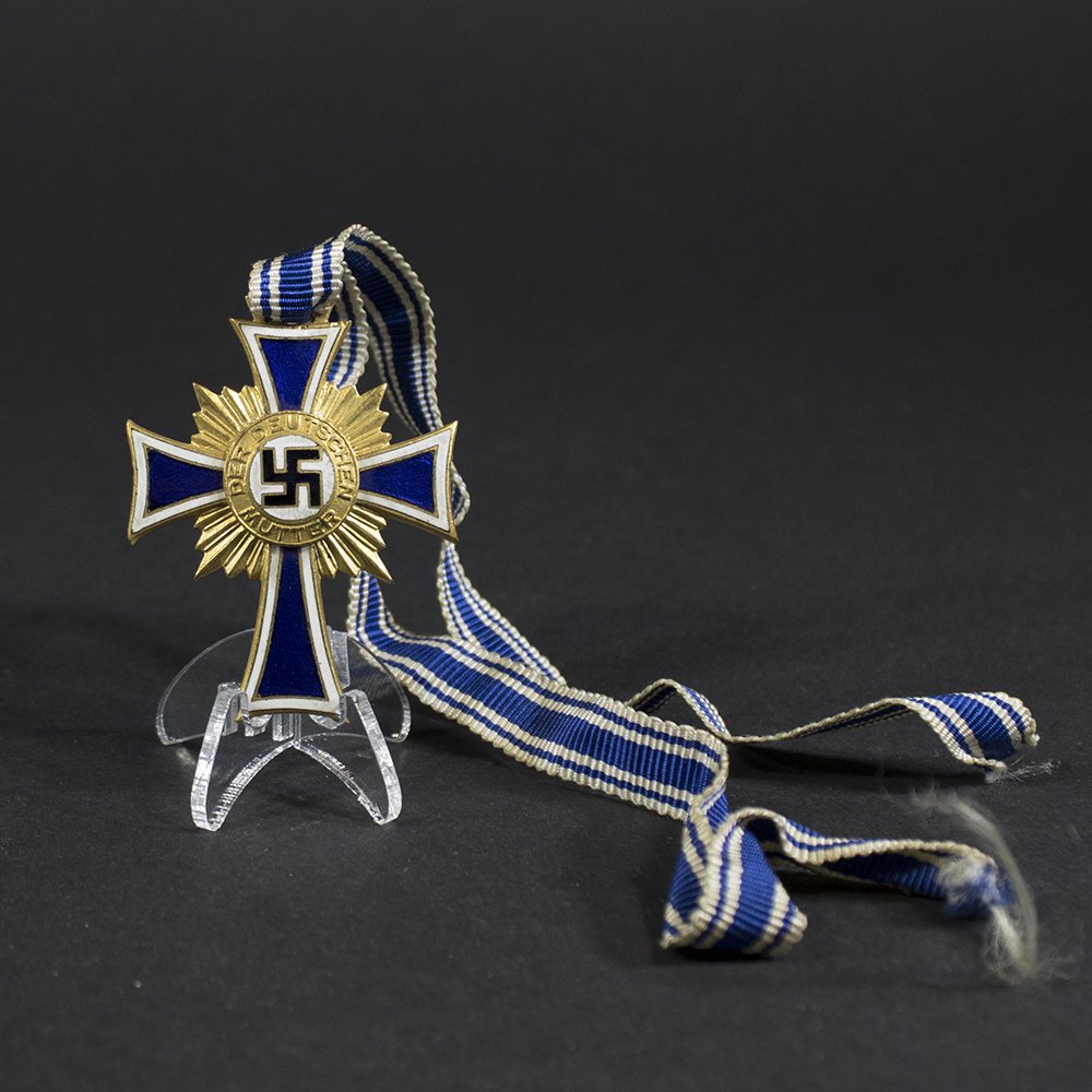 About the item: Very nice and in very good condition golden (for having 8 or more children) mothers cross. About the Mothers Cross: The Mother's Cross (Ehrenkreuz der Deutschen Mutter) is a state decoration that Adolf Hitler introduced on December 16, 1938. The award formed part of a broader Nazi strategy to reshape German society according to fascist ideals, focusing on population growth, racial purity, and strict gender roles. Although it honored motherhood, the decoration reinforced the regime's racial and ideological goals. Ideological Foundations The Mother's Cross served as a propaganda tool promoting the Nazi ideal of the 'Aryan' woman as a mother and homemaker. The regime emphasized women as bearers of the next generation of racially pure Germans, restricting their roles to domestic duties. The Nazi slogan 'Kinder, Küche, Kirche' (Children, Kitchen, Church) reflected this worldview. The award supported demographic policies aimed at reversing Germany's declining birthrate and preparing for future expansion. Hitler and his advisors insisted that a strong, racially pure population was essential for the Third Reich's success and its long-term goals, including acquiring Lebensraum (living space) in Eastern Europe. Click HERE for more info about the Mothers Cross