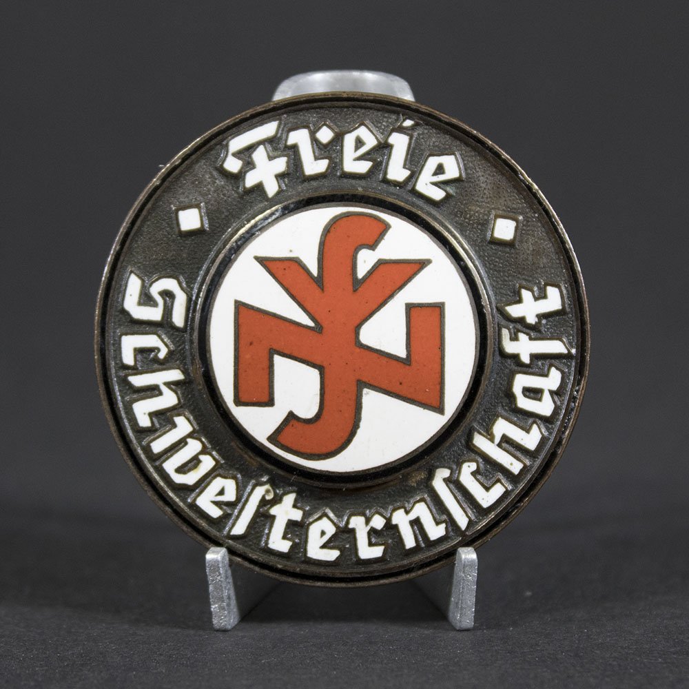 About the item: This 'Freie Schwesternschaft' brooch belonged to the Reichsbund der Freien Schwestern und Pflegerinnen, a German nurses' association. The brooch features black, red, and white enamel and a silver-colored outer border with the inscription 'Freie Schwesternschaft'. It remains in good used condition, showing normal wear and minor scratches. The brooch includes a fully functional pin and hook.