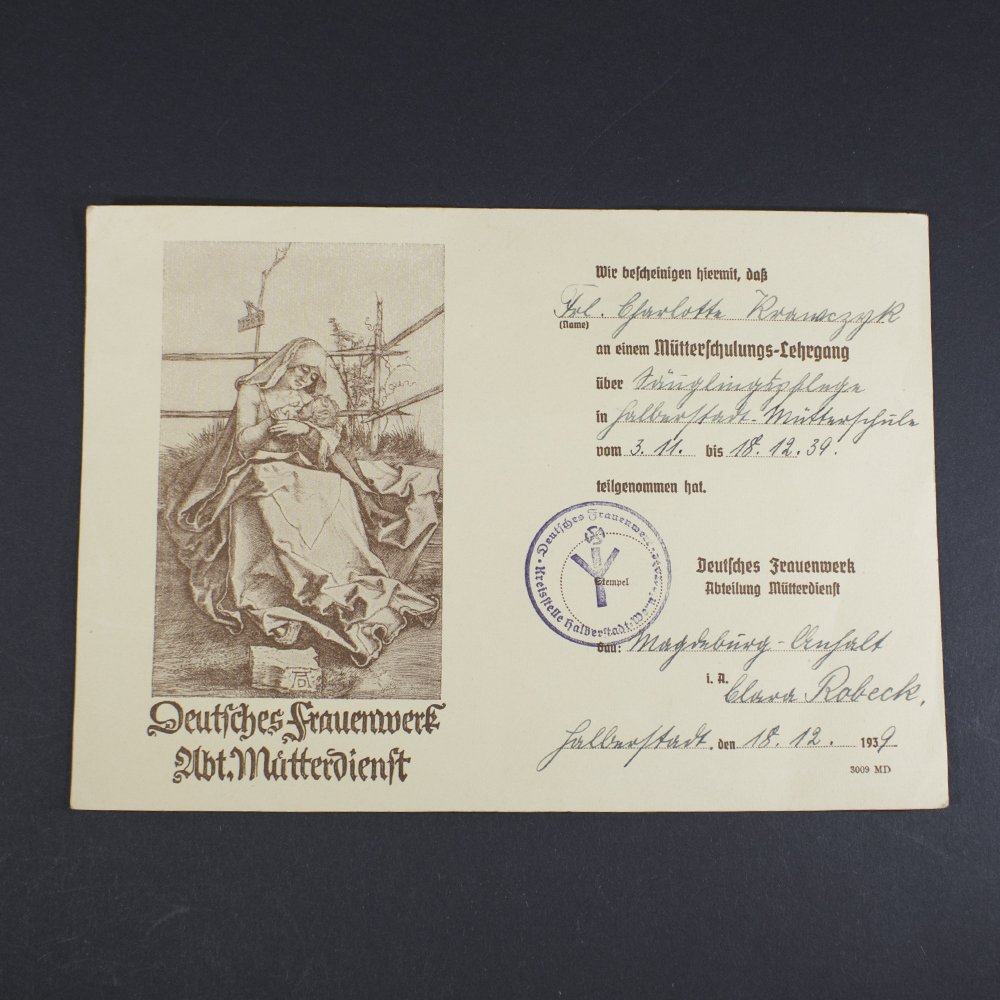 About the item: Very nice and in very good condition Deutsches frauenwerk abt mutterdienst' certificate. This card was from a German mother who took some classes at the DFW. About the DFW: Das Deutsche Frauenwerk (DFW) was a National Socialist women's organization established in October 1933. Alongside the NS-Frauenschaft, the DFW served as a central body for members of the gleichgeschalteten (coordinated) women's associations from the Weimar Republic. These included nationalist and conservative women's groups such as the Bund Königin Luise, Evangelisches Frauenwerk, the Sisterhood of the German Red Cross, and the Reichsbund der deutschen Hausfrauen. The DFW played a key role in aligning women's activities with Nazi ideology, promoting traditional gender roles, and integrating existing women's organizations into the regime's social and political framework. Click HERE for more info about the Reichsparteitag