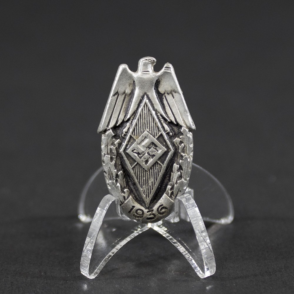 About the item: Nice Hitler Youth Siegernadel Reichssportwettkämpfe 1936. Unfortunatly the needle is missing. About the Reichssportwettkämpfe: In the early years of the Third Reich, sports played a subversive role as a form of military preparation, due to restrictions imposed on Germany by the Treaty of Versailles. As a result, sporting events were highly valued by the NSDAP, and awards were issued at both national and local levels to victorious athletes. Even after military conscription was reintroduced, youth sporting events remained important as pre-military training and physical conditioning exercises. From late 1934, Hitler Youth Sports Festivals were organized across Germany. Initially called 'Sport-' or 'Jugendfest,' these events were renamed 'Reichsportwettkampf' (National Sport Competition) after 1937. Hitler Youth members who achieved above-average scores in three sports contests were awarded badges along with 'Ehrenurkunden' (honor certificates). The badge itself is made of solid cast aluminum, shaped as a vertical oval. It features the Hitler Youth diamond with a mobile swastika at the center, surmounted by an eagle, flanked by oak leaf sprays, and embossed with the year '1936.'