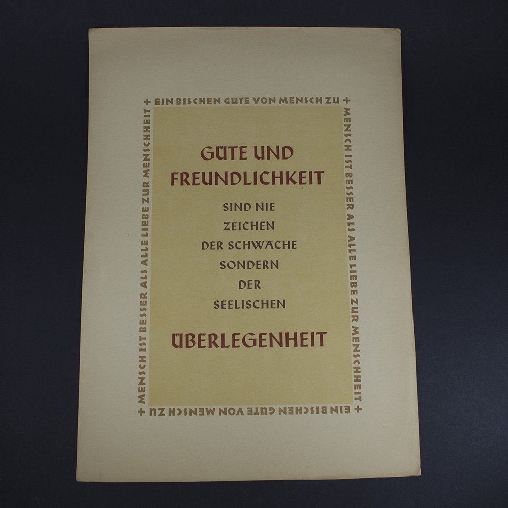 About the item: Very nice and in very good condition NSDAP Wochensprüche (#30, 19 - 25 July 1942) English translation: 'Generosity and friendship are never signs of weakness, but of spiritual superiority. A little generosity from person to person is better than a general love of humanity.' About the Wochensprüche : The Wochenspruch der NSDAP ('Weekly Quotation of the Nazi Party') was a widely distributed propaganda wall poster published by the Nazi Party from 1937 to 1944 in Germany. These posters featured weekly quotations, mainly from leading Nazi officials, and served as a powerful tool for spreading Nazi ideology. Approximately 1,100 issues were produced, with editions published by the Reich Propaganda Directorate and local party organizations in each Gau (regional district). Wochenspruch der NSDAP posters were prominently displayed in public spaces such as town halls, schools, workplaces, and shop windows throughout Germany. This extensive distribution ensured that Nazi propaganda and party messages reached millions of people, reinforcing Nazi ideology in everyday life and shaping public opinion during the Third Reich. Click HERE for more info about the Wochensprüche. Click HERE for a list of theWochensprüche (At Calvin Univerity) Click HERE for more info about the NSDAP.
