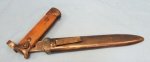 Original era manufacture. Red tinge finish to the folding blade, overall clean showing typical wear and use. Locking/folding mechanisim works just fine, decent wood grips with an operable pommel lock button. Blue steel finished scabbard with a belt loop on its reverse. Obverse of the scabbard shows some considerable surface corrosion, not so much on the reverse.