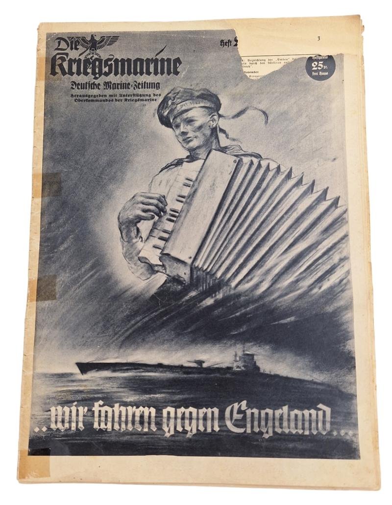 in a havy used condition die kriegsmarine date can no longer be read Die Kriegsmarine' magazine was the official magazine of the German Navy during WWII and was published twice monthlyto serve german reich propaganda purposewith a cover where unfortunately a piece has been torn out in a heavily used condition