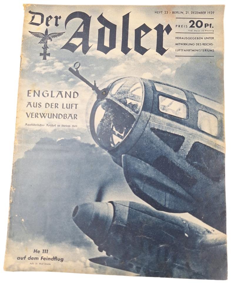 in a used condition a der adler December 21, 1939der adler was a biweekly Nazi propaganda magazine published by the Scherl Verlag, founded by August Scherl, with the support of the Luftwaffe High Command. From 1939 to 1944, 146 magazine issues were published in total.this is a der adler der December 21, 1939in used condition. , overall a very nice condition with a great cover